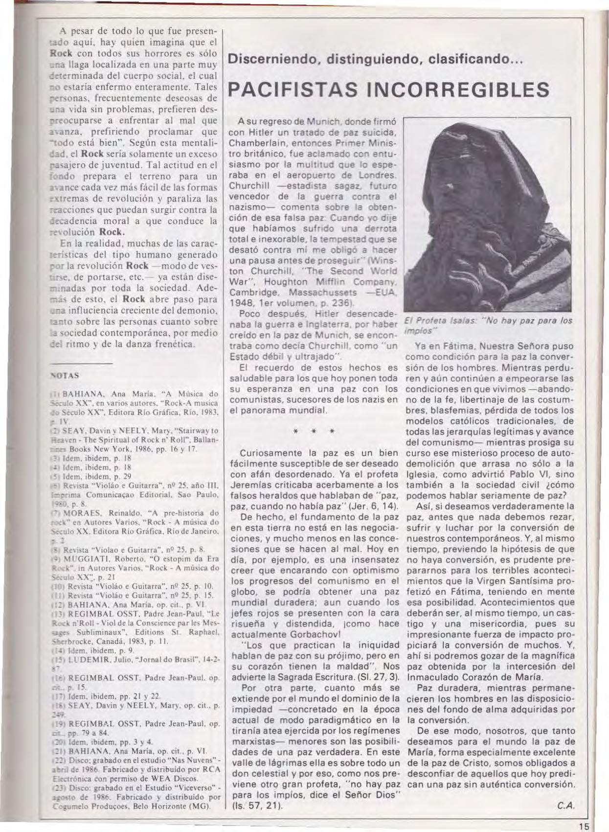 e) Numerosas personalidades euro peas y americanas manifiestan, no obs tante, viva confianza en las intenciones pacifistas del actual gobierno ruso. Lo que les lleva a relegar a un segundo plano, en sus cómputos de política inter nacional, el peligro de una agresión soviética. Y a propugnar una política de confianza en las intenciones del comu nismo internacional. Esa política, nacida de la atmósfera pacifista de Valta, pro cura evitar la agresión rusa por medio de una verdadera desmovilización psicoló gica, económica, diplomática y militar de Occidente, frente al misterioso mundo del Telón de Acero.
