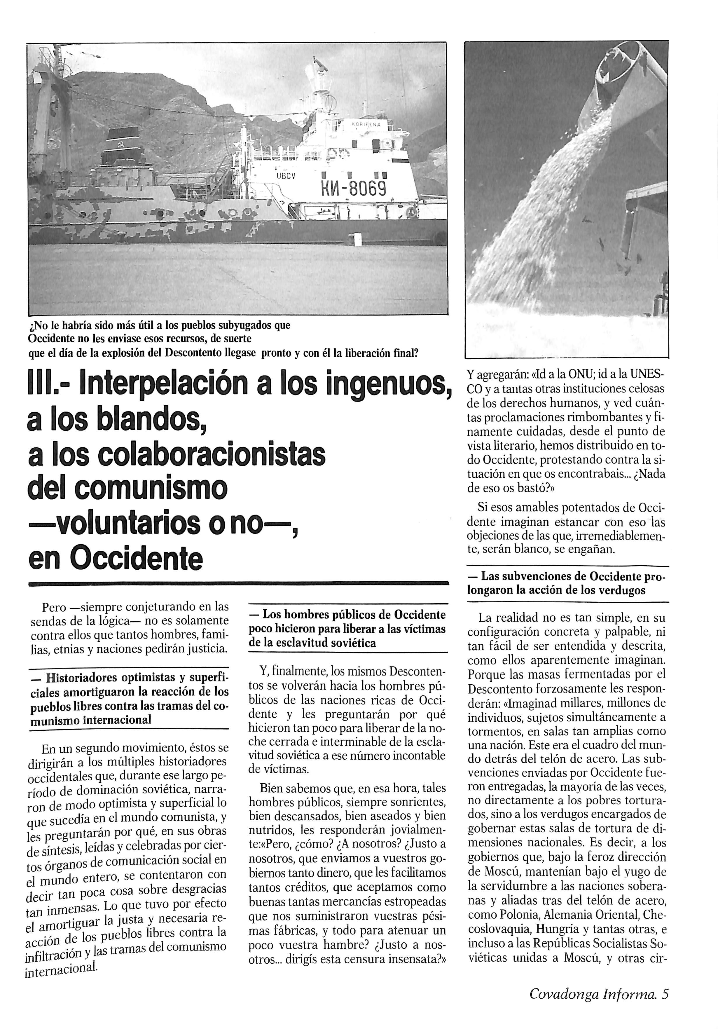 La obra,titulada:«¿/7asto cuándo las Amé ricas tolerarán al dictador Castro, el impla cable stalinista que continúa oprimiendo al pueblo cubano y amenazando a naciones hermanas?»,hace un minucioso análisis del modelo «católico-comunista»,que Fidel pre tende exportar a toda Sudamérica. Dicho modelo viene a ser una simbiosis entre el comunismo cubano,stalinista, y las corrien tes más avanzadas de la «izquierda católica».