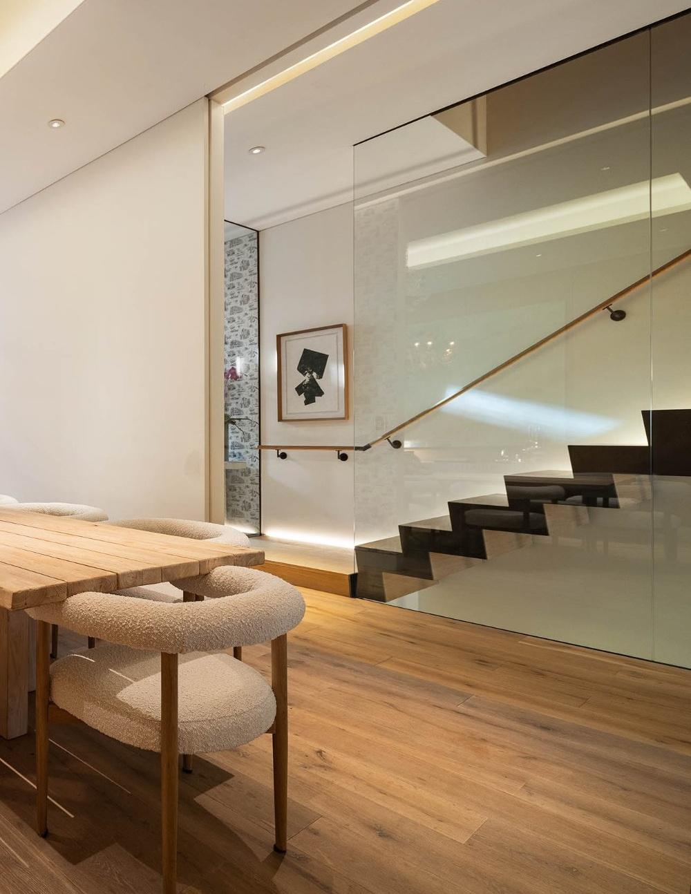 A dramatic glass-walled staircase and built-in library shelving run the full length of the parlor floor, bathed in natural light.