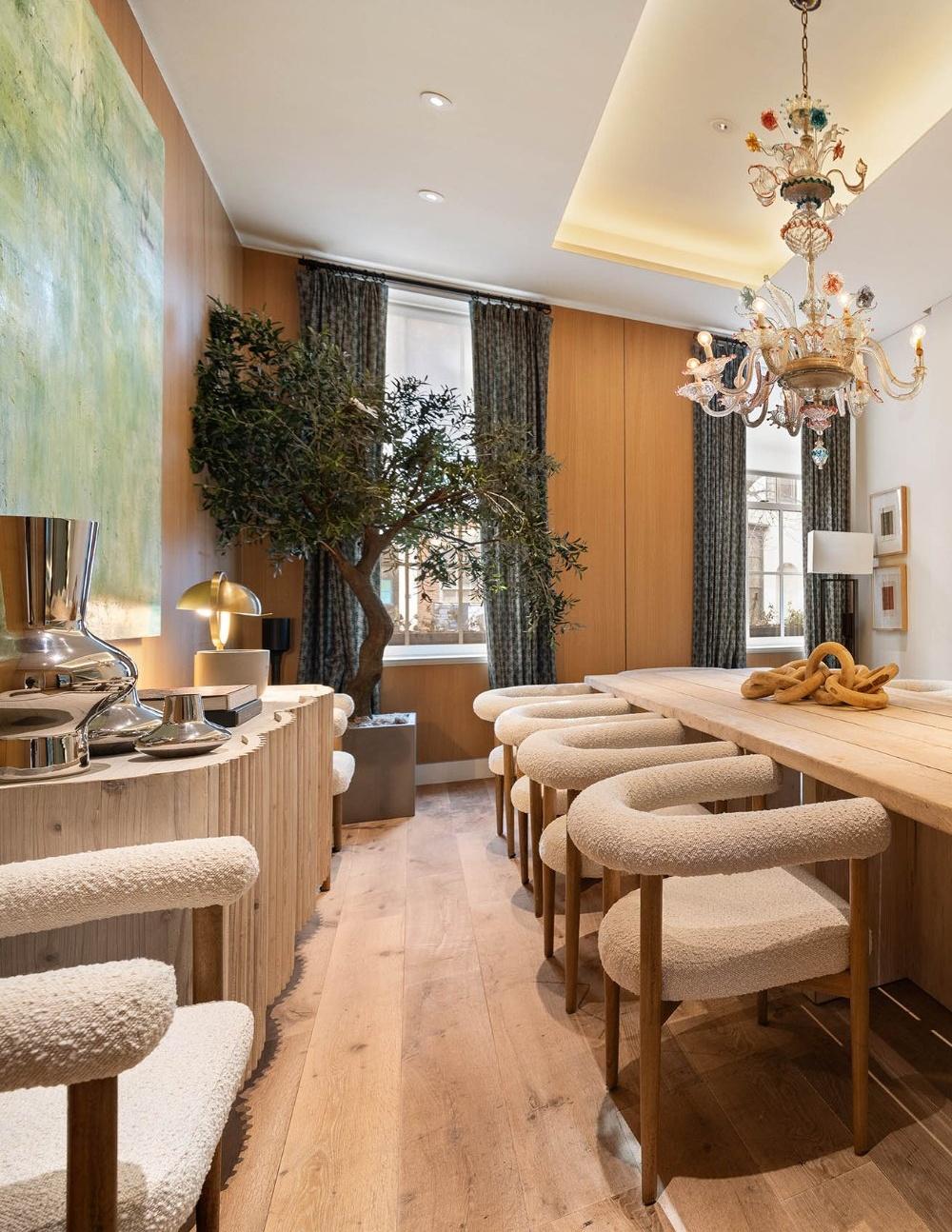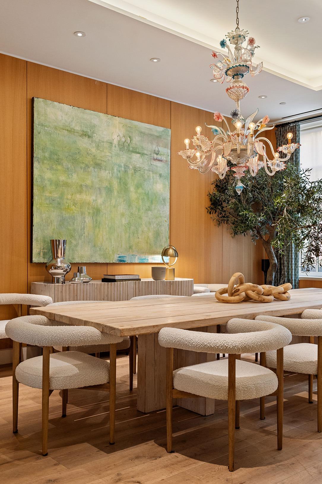 A Murano glass chandelier, bespoke wood-paneled walls, and an indoor olive tree define this stunning entertaining space seating fourteen.