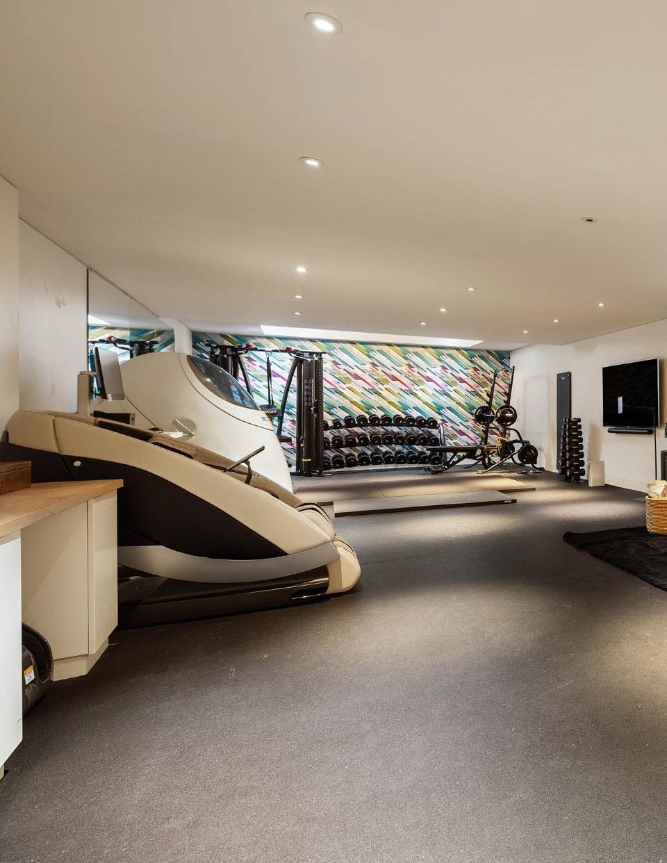 A full-floor private gym with professional equipment, massage chair, infrared sauna, and cold plunge — wellness at its finest.
