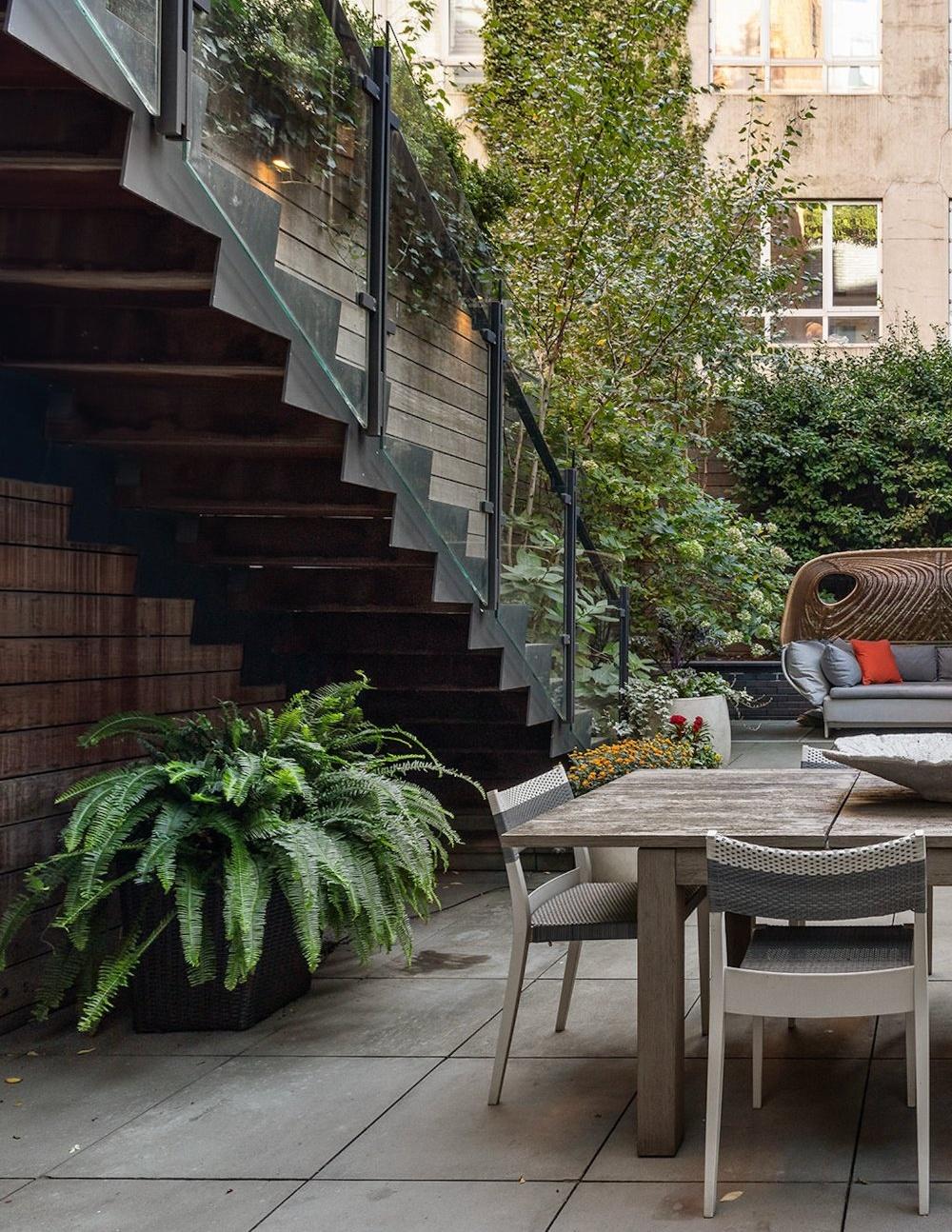 A lush landscaped oasis with outdoor kitchen, dining terrace, and seating — an extraordinary retreat in the heart of the Village.