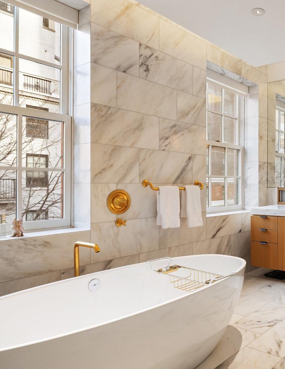 Calacatta marble, gold fixtures, freestanding soaking tubs, and oversized rain showers across ten spa-caliber bathrooms.