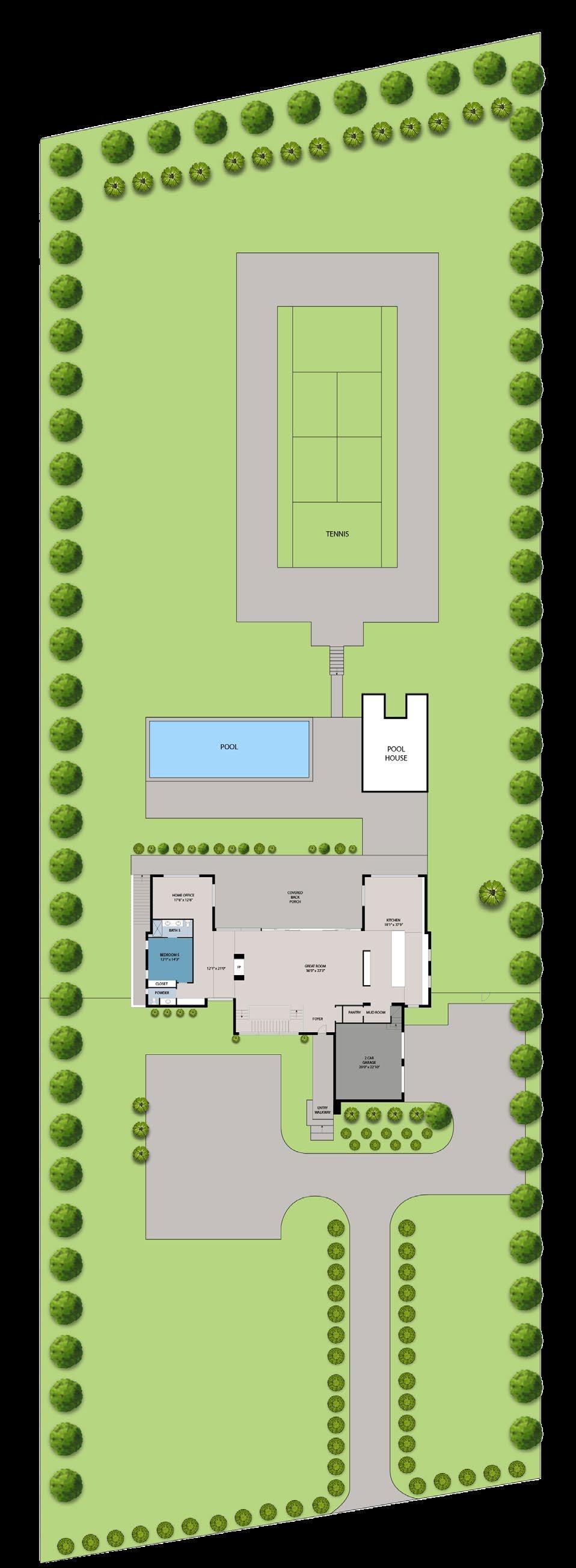 A discreet mudroom, powder room, and pantry connect to the attached two-car garage, offering elevated convenience and everyday functionality.