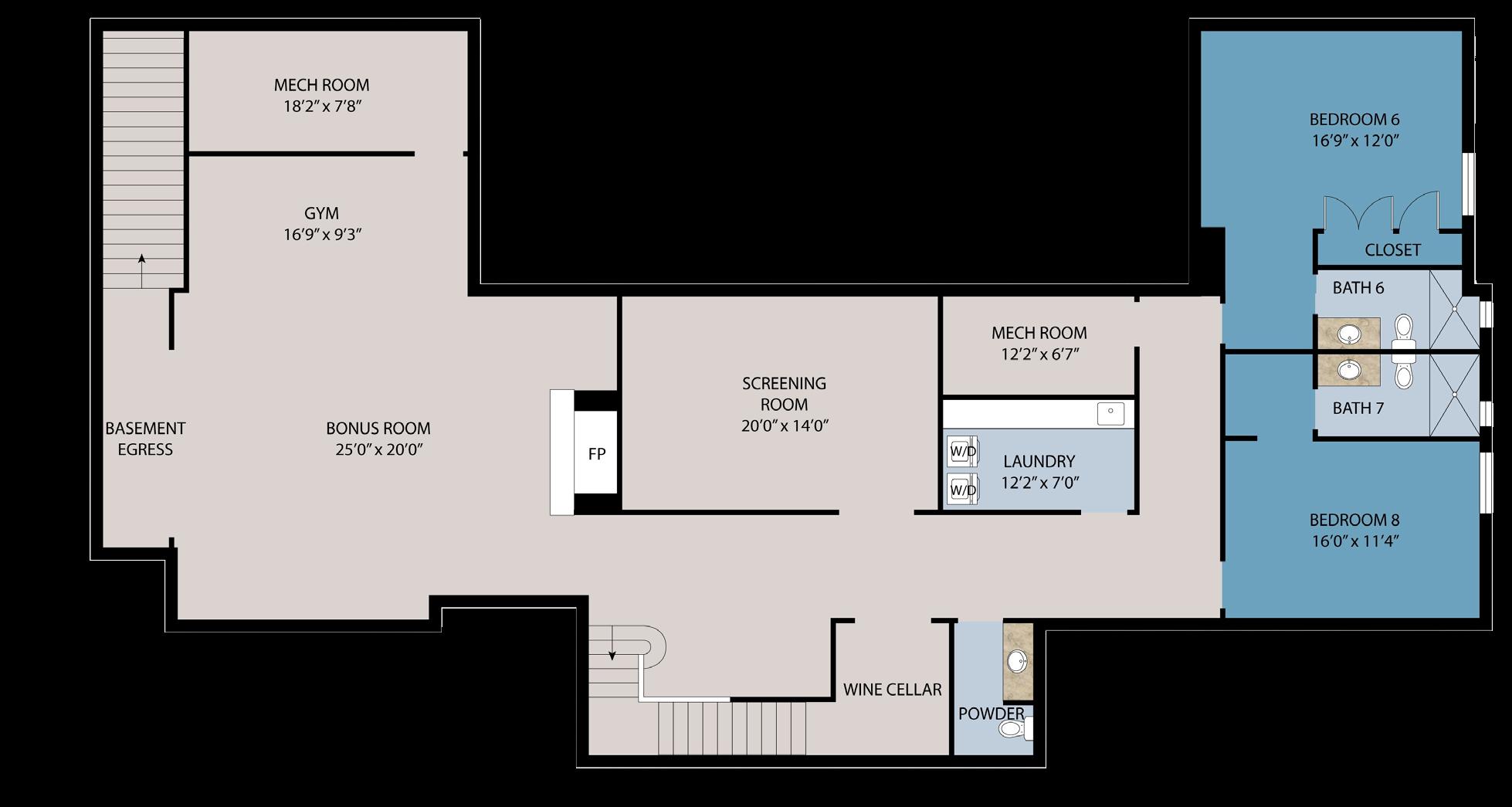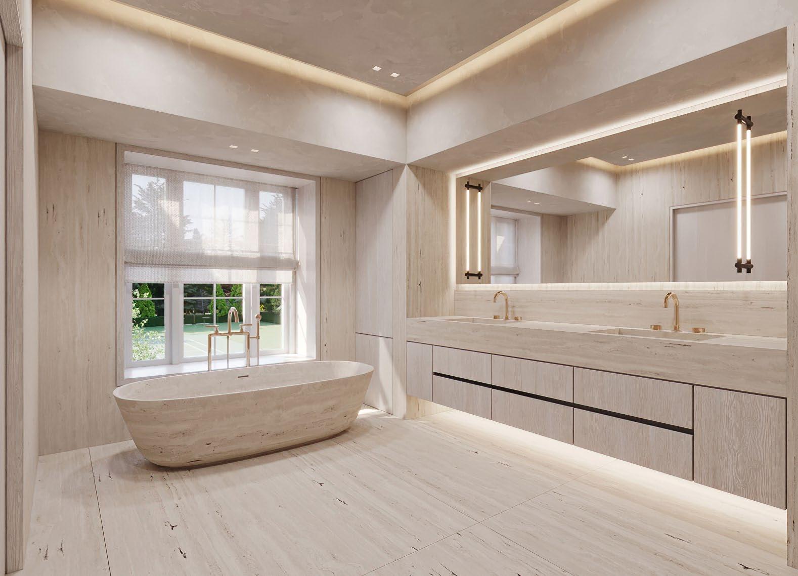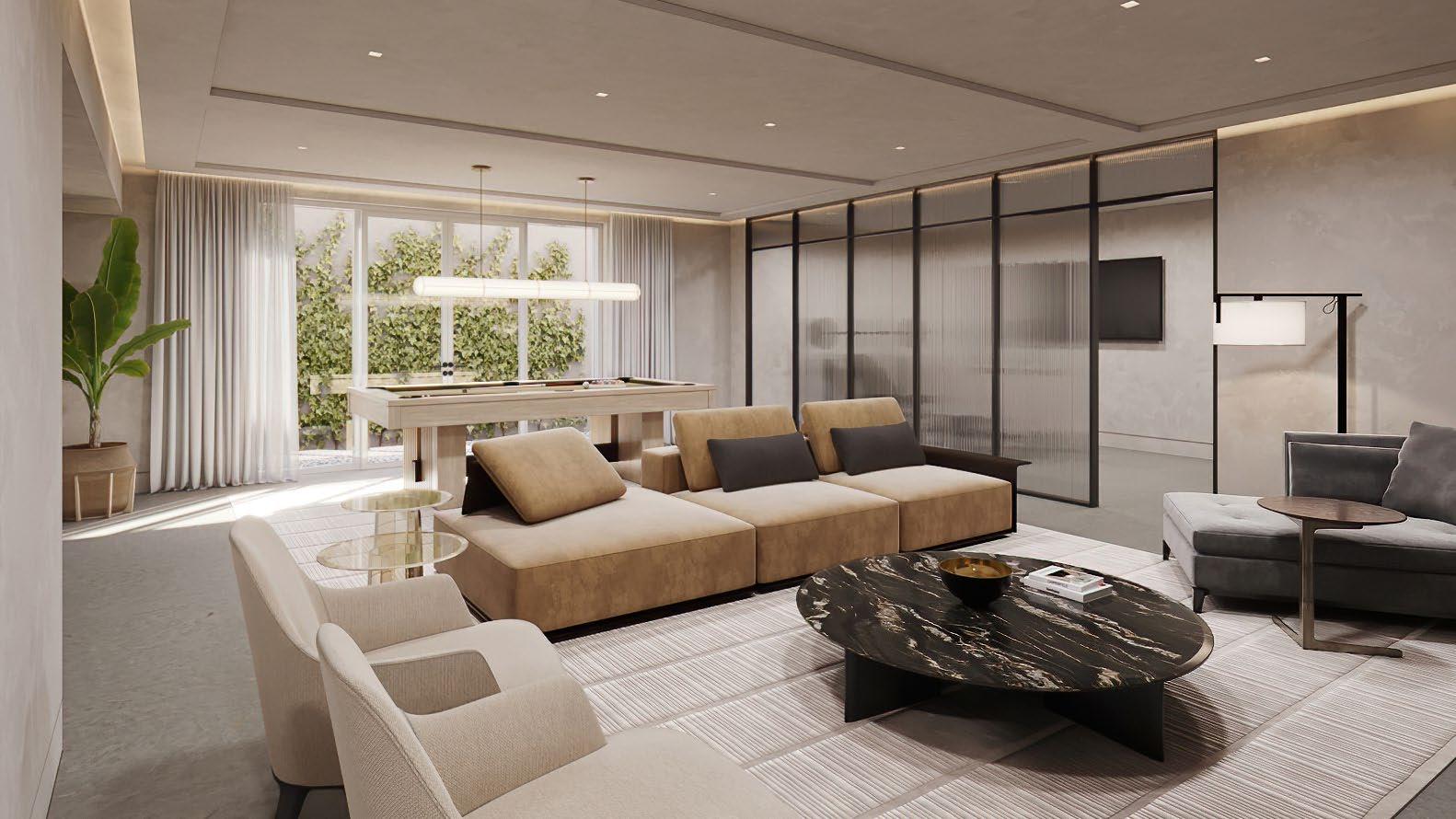The lower level is designed for wellness and recreation, with over 2,200 square feet of flexible living space that includes a gym, screening room, sauna, and two additional en-suite guest baedrooms.