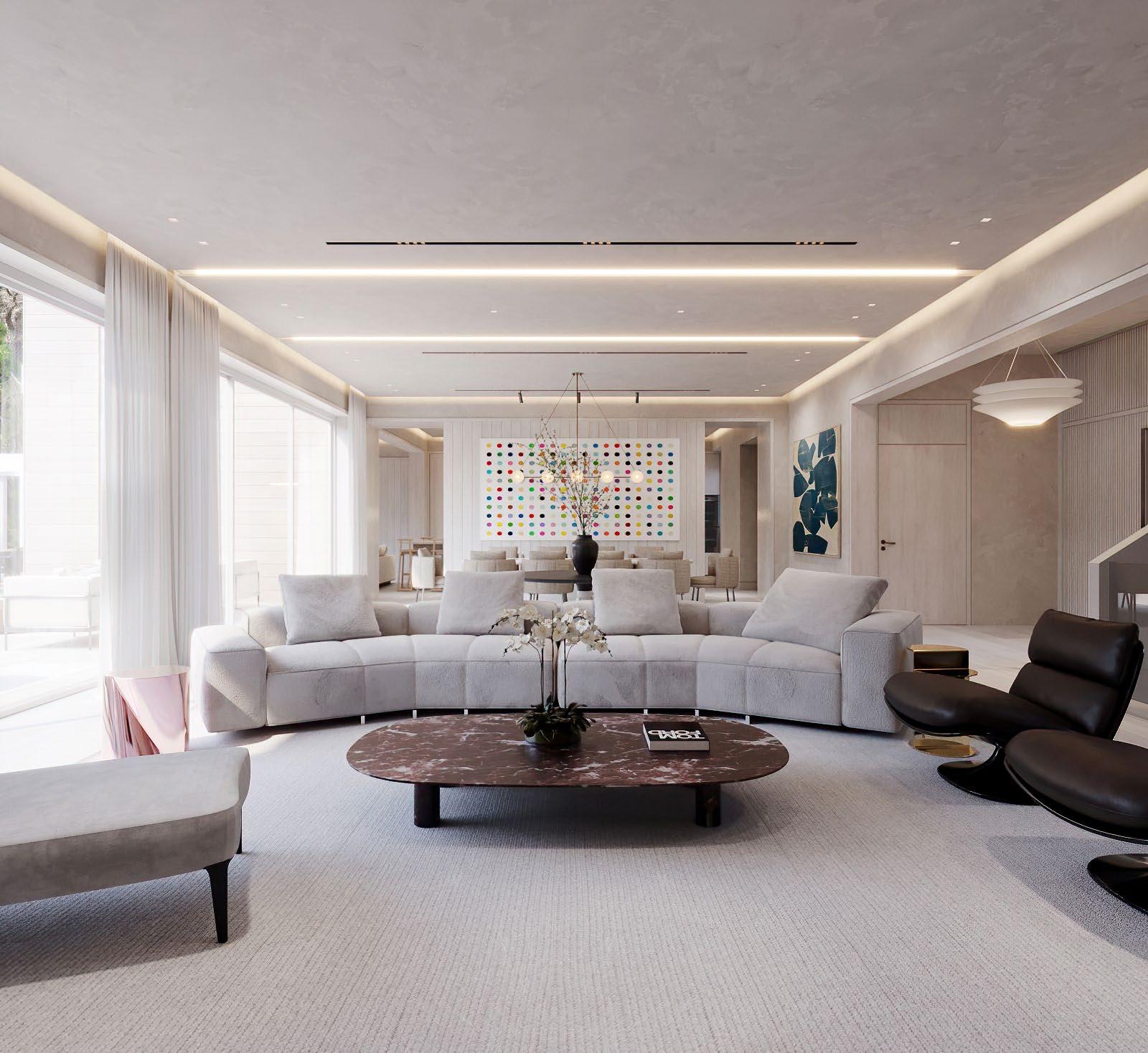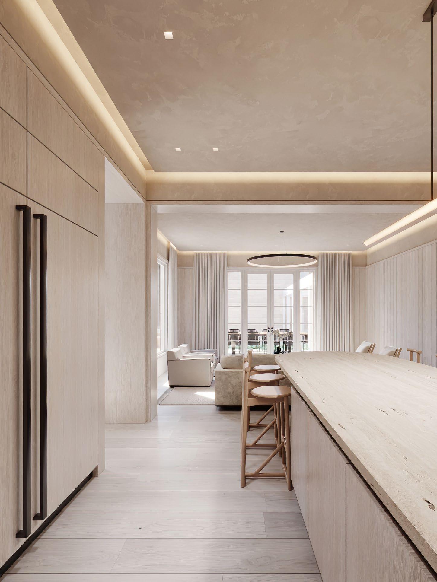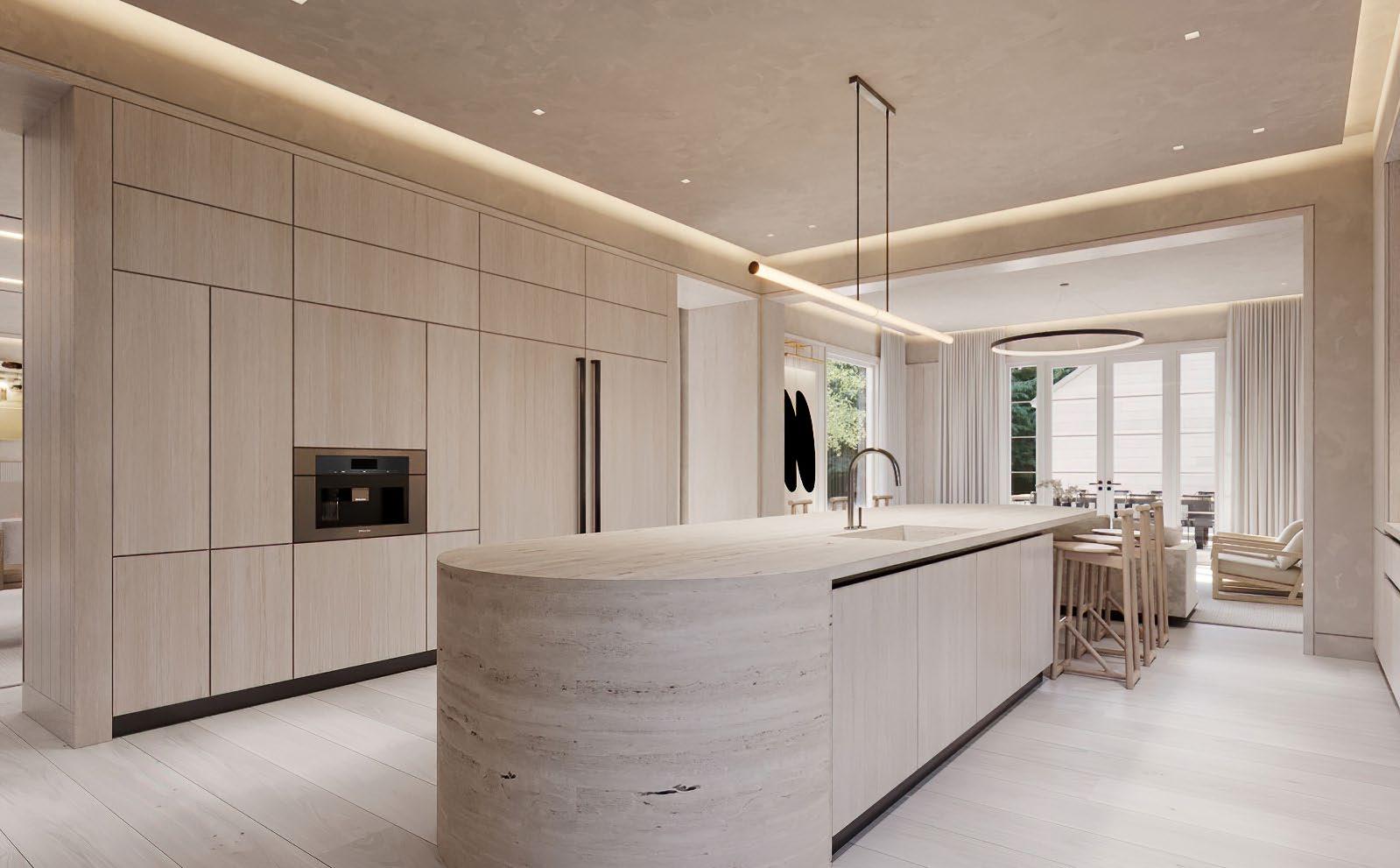 Nearby, the open kitchen is thoughtfully outfitted with integrated Gaggenau appliances, seamless custom cabinetry, and soft LED cove lighting.