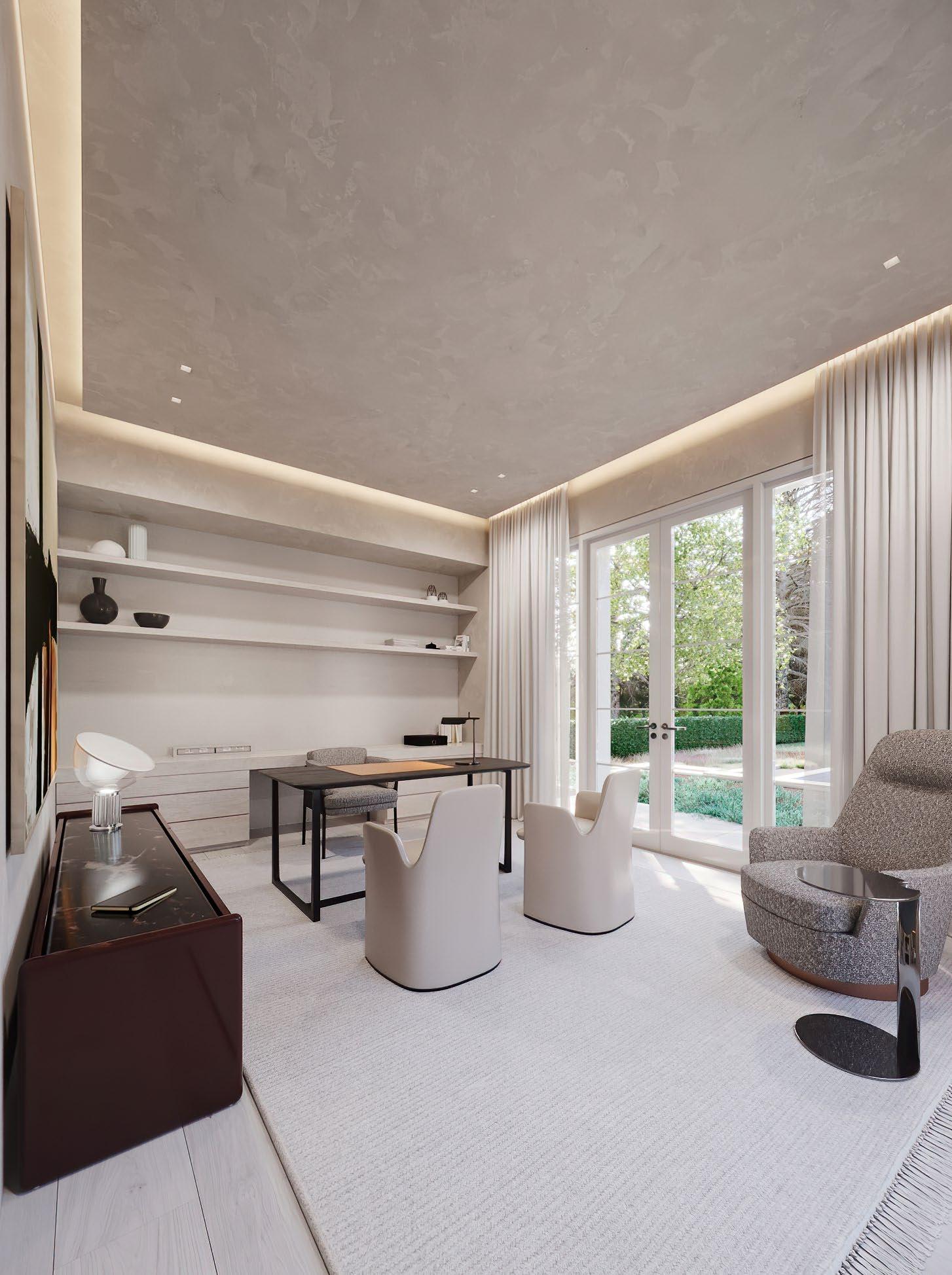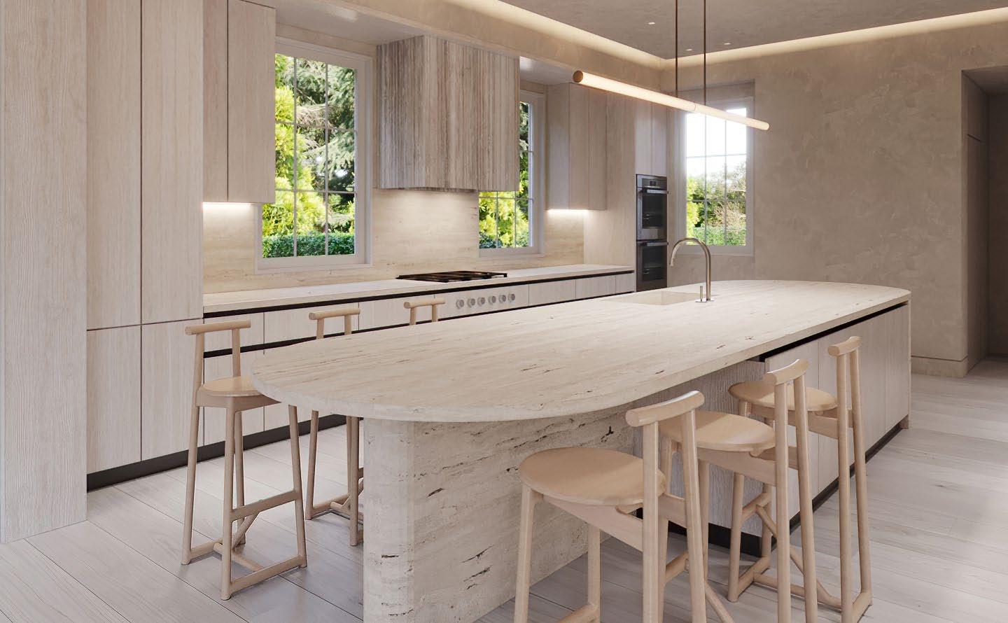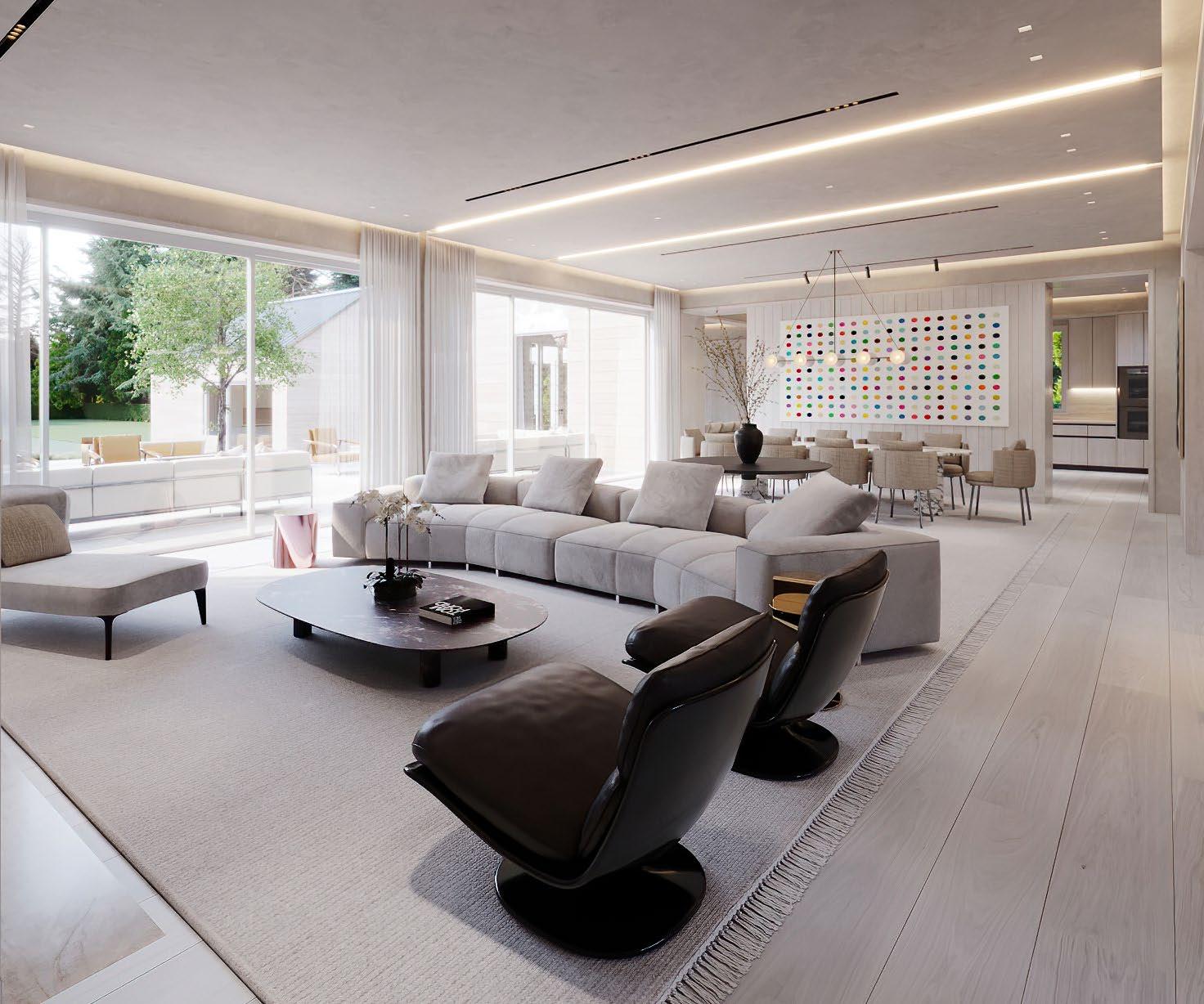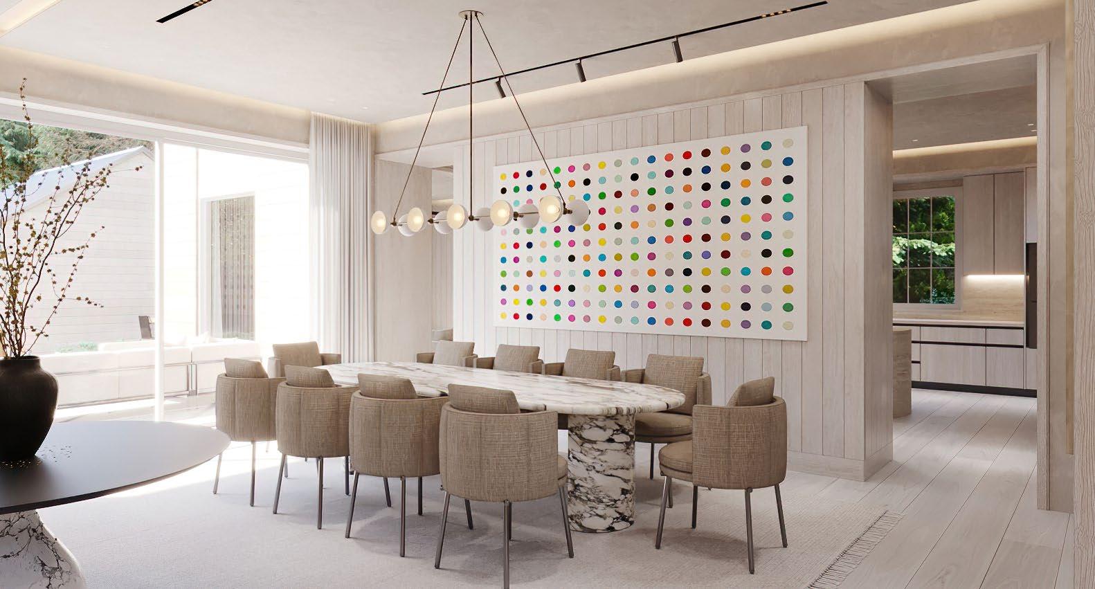 Nearby, the open kitchen is thoughtfully outfitted with integrated Gaggenau appliances, seamless custom cabinetry, and soft LED cove lighting.