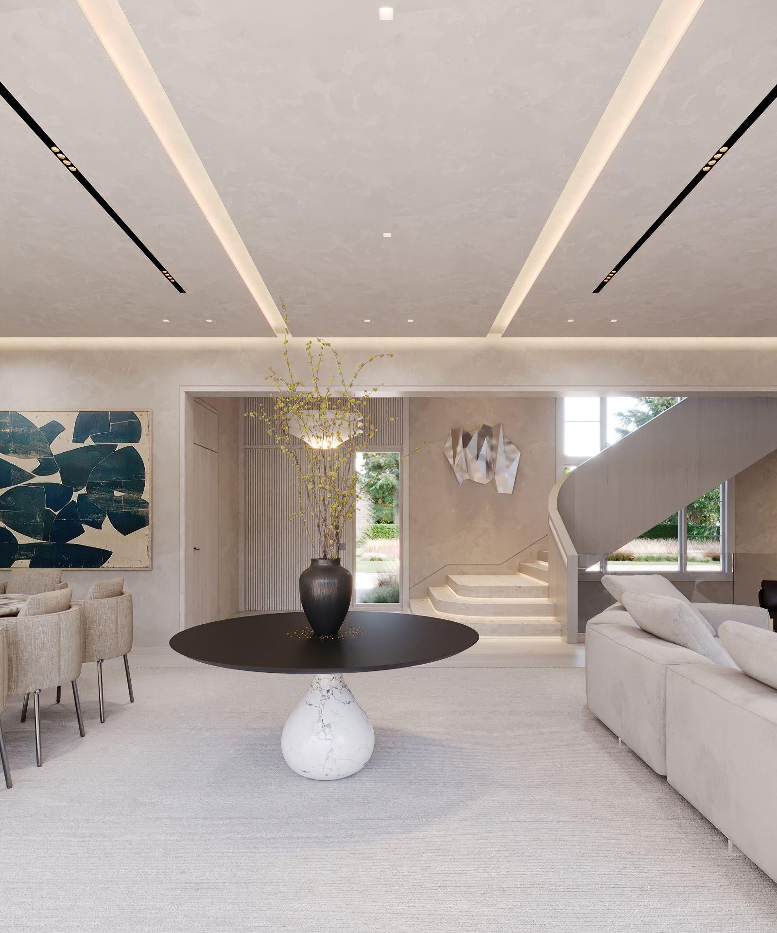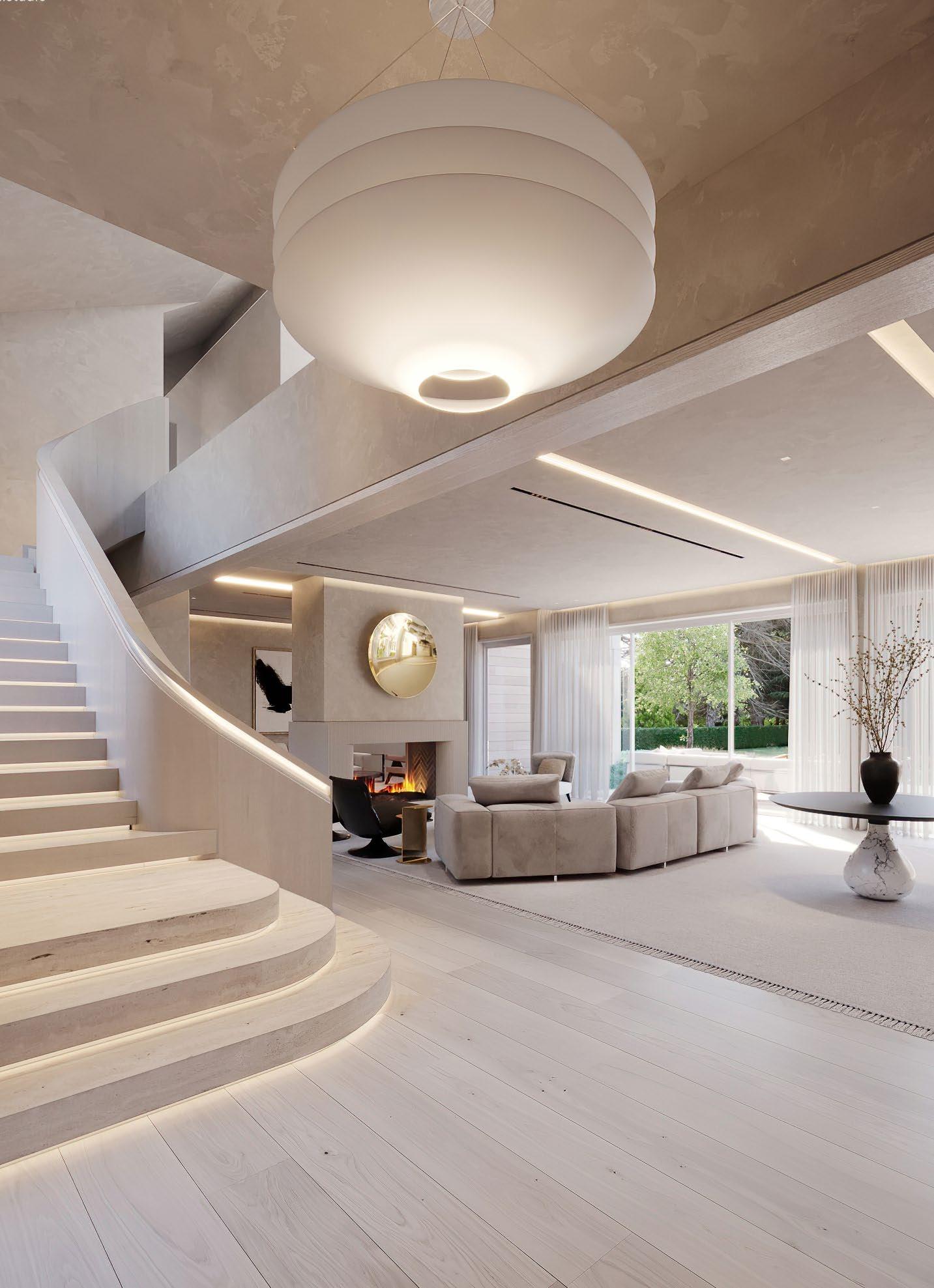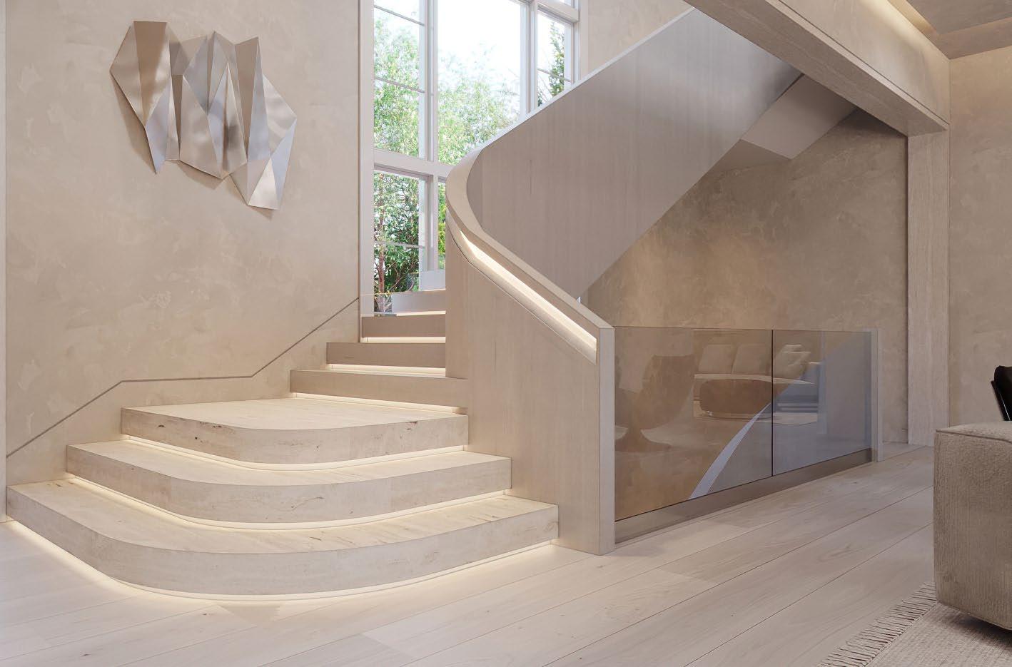 A sweeping, sculptural staircase illuminated by built-in LED lighting sets the tone -- artful yet inviting, sophisticated yet grounded.