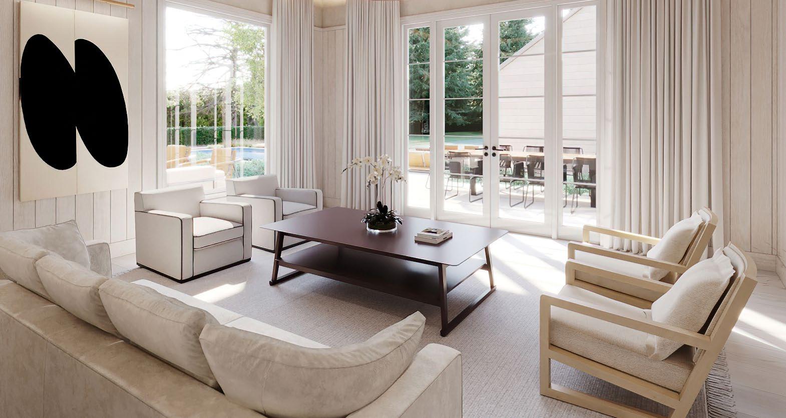 A dramatic great room unfolds beneath soaring 10-foot ceilings. Floor-to-ceiling glass frames sweeping views of manicured gardens and iconic Sagaponack farm fields, filling the space with natural light.
