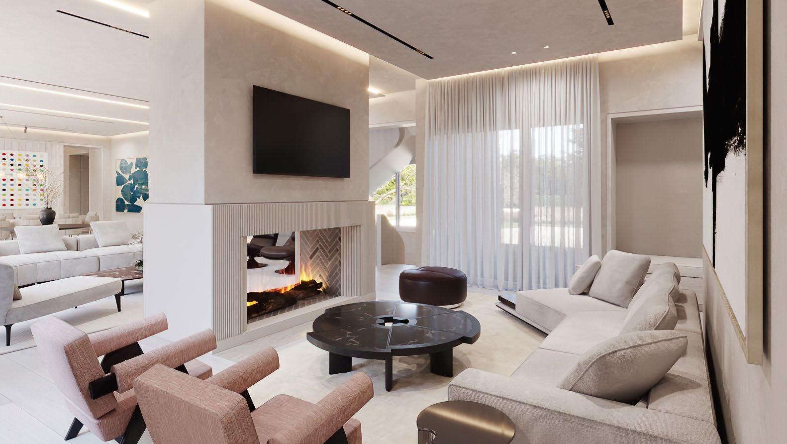 Centered around a sleek linear gas fireplace, multiple seating areas offer seamless versatility for entertaining or quiet relaxation.