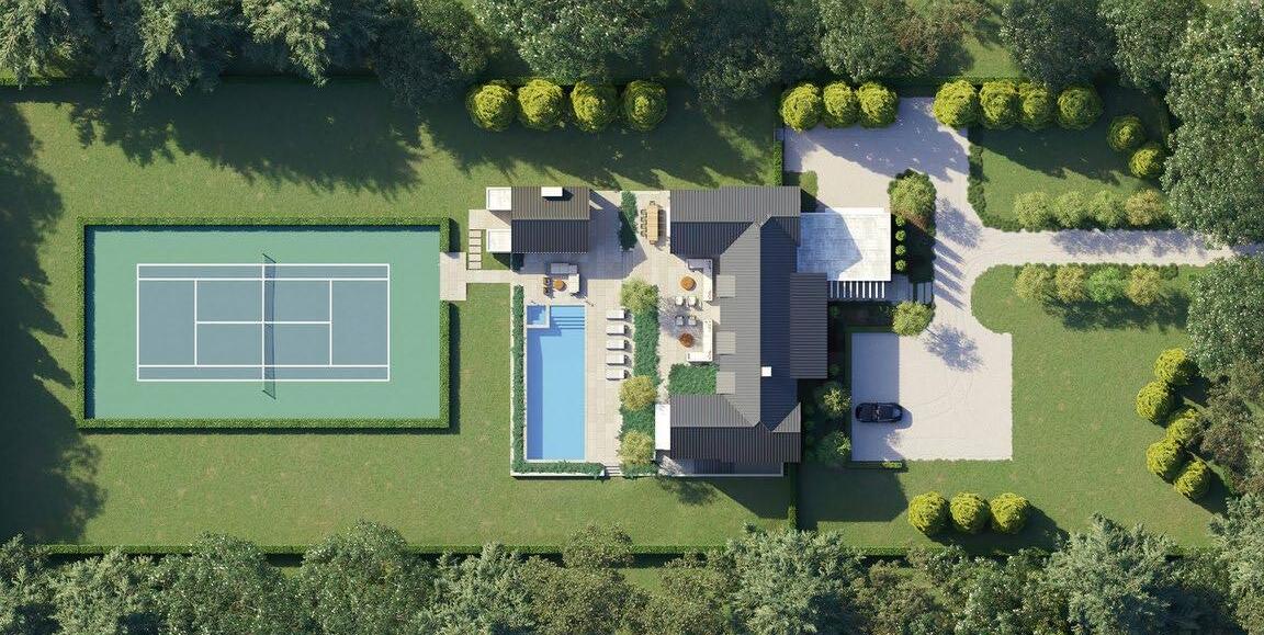 Outdoors, the experience is pure resort living. A 20’ x 50’ heated saline pool and 10’ x 10’ spa are framed by lush gardens and custom bluestone patios. The 517 SF ± pool house includes a full bath, half bath, and lounge area. Nearby, a 60’ x 110’ hard-surface tennis court and fully outfitted outdoor kitchen complete the estate’s unrivaled amenities.