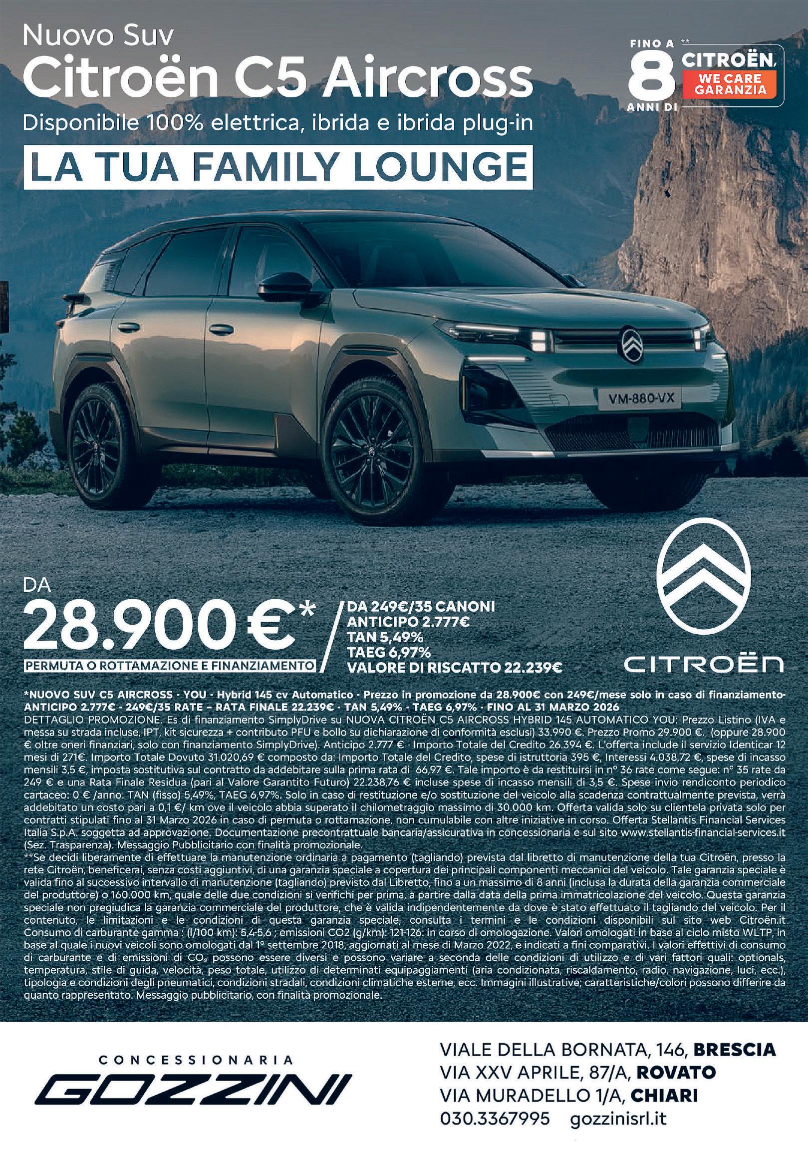 Protagonista del segmento C-Suv, il terzo in Italia per volumi e storicamente strategico per Citroën, il nuovo Citroën C5 Aircross è pensato per chi desidera vivere ogni viaggio all’insegna del benessere. Grazie alle sospensioni Advanced Comfort, ai sedili di ultima generazione e a un’inedita silenziosità a bordo, il comfort raggiunge livelli di riferimento nel segmento. Il design è deciso, moderno e aerodinamico, con un frontale rinnovato, nuovi gruppi ottici LED e dettagli eleganti che ne esaltano il carattere. All’interno, l’abitacolo offre una modularità straordinaria e un bagagliaio generoso.