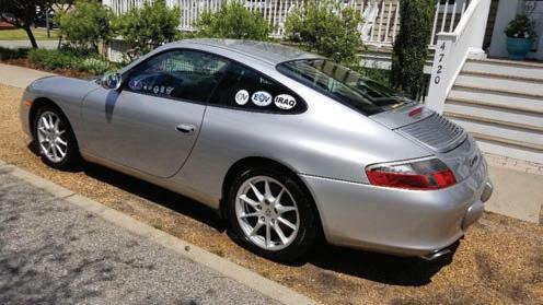 I overheard John talking about someone wanting an article for something called “H.O.” about pets who love their Porsches. I thought, “This is my chance…again.” I’ll be honest, though; I don’t. I mean, really. Look how small that thing is! John jokes about how he won a prize for the most stickers on his windows.