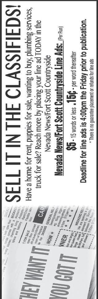 The Nevada News/Fort Scott Countryside makes every effort to meet advertisers’ special requests, but CANNOT GUARANTEE position on any specified pages or sections. The publisher is not responsible for copy omission, typographical errors or any unintentional errors that may occur in advertisement other than to correct it in the next issue after error is brought to publisher’s attention. In any event, the publisher’s liability shall be limited only to the amount of space consumed by such error. Errors must be brought to the attention of the publisher within 24 hours of publication for such claims. The publisher reserves the right to revise or