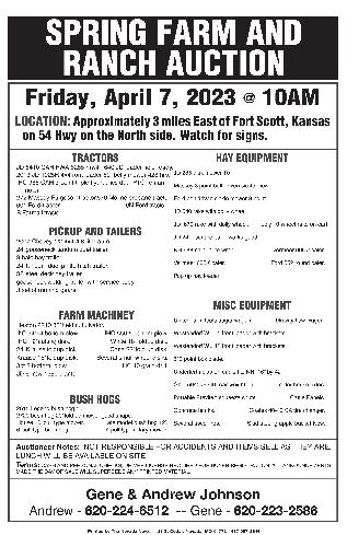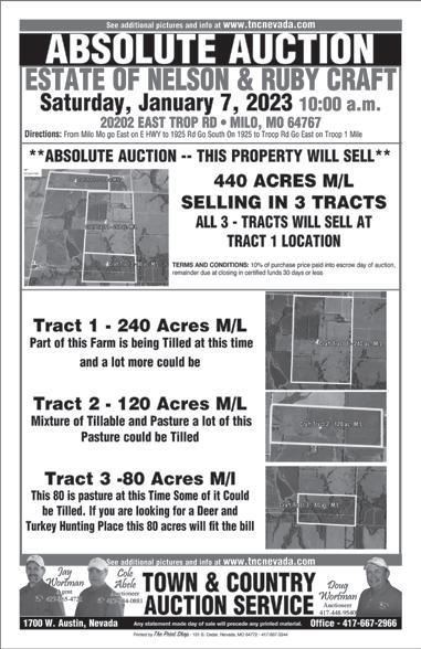 PRSRT STD U.S. Postage Paid Permit No. 40 Nevada, Mo. 64772 131 S. Cedar Nevada, MO 417-667-3344 6 N. Main Fort Scott, KS 620-223-2110 VOL. 90 WEDNESDAY, APRIL 26, 2023 NO. 06 The area’s only delivered paper to 34,000 readers each and every week. Total market coverage for both Vernon County, Missouri and Bourbon County, Kansas Your Leader in Precision Ag Since 1999 Hi! This is Crystal of Deanna E. Francis Tax Service 128 W. Walnut Nevada, MO 417667-5139 Let me help with your tax, accounting and payroll needs. Home businesses, small/medium businesses, farms.....all sizes welcome. Call for an estimate Hall Rental Available 3313 East Austin • Nevada #3770 • 417-667-9283 Public Welcome • Dinners 6-8pm Wed., April 26 Chicken Strips - $8 Fri., April 28 Charity Dinner - $10 Dunlap Kidney Fund. Fried Chicken w/mahsed potatoes and gravy, veggies & dessert AVOID MEDICAID SPEND DOWN for Nursing Home Care Call 417-667-5500 Kendall Vickers TOWN & COUNTRY Real Estate & Auction Service DOUG WORTMAN - 417-448-9540 doug@tncnevada.com Broker/Auctioneer Licensed in Missouri & Kansas Farms • Estate •Antiques www.tncnevada.com See our Real Estate ad on page 15 BROPHY MONUMENT SERVING NEVADA AND VERNON CO AREA WITH Quality Since 1888 305 E Cherry N Nevada, MO 64772 417-667-6136 Owners Mark & Penny Baldwin Lowry Hearing Aid Center 417-667-2929 or 800-777-4818 425 East Walnut Street • Nevada, MO www.lowryhearing.com Introducing technology-. The newest Audibel innovation for effortless hearing in any environment. Town & CountryReal Estate & Auction Service Ranches • Farmland • Hunting Land Troy Scotten 417-448-7163 troy@tncnevada.com Taylor Scotten 417-684-1224 ctscotten@gmail.com 1700 W Austin Blvd., Nevada, MO 64772 417-667-2966 • www.tncnevada.com Licensed in Missouri & Kansas Sunday, April 10th, 2016~1:00 PM LOCATION: 26280 South 1425 Road, Sheldon, MO; Directions: From Sheldon Go West On N Hwy To 1425 Road Then North To Sale Site Or From Nevada Go South On BB Hwy To 1425 Road Then Continue South To Sale Site (Watch For Signs) Auction For Barb & The Late Ivan Diggins Auctioneers Note: As Ms. Diggins Has Sold Her Farm We Will Offer A Very Clean & Outstanding Farm & Estate Auction. Equipment & Tools Are Very Clean & Ready. There Are Some Very Neat Households, Beer Items & Antiques. This Is A Very Nice Auction. Something Here For Everyone. Please Plan Now To Attend. Sale Order: Furniture, Households & Antiques, Will Sell First Followed By Small Tools & Outdoor Items. At Approx 3:00 PM Will Offer Tractors, Auto, & Large Items. Remainder Of Small Tools & Outdoor Will Finish Auction. See Ya There!!! Terms: Cash or check with proper ID. Now accepting most major credit cards. Nothing removed until settled for. Statements mad e the day of sale takes precedence over printed material. Everything sold as is where is. Not responsible for accidents. Restroom available. Conces sions Provided By Pig Out Grill. Check our website for upcoming auctions and for additional pictures!! Magnum 325 4 Wheeler, JD 190 Walking Plow, Fuel Barrel On Stand, Tractor Wheel Chains, 16 Ft Gate, Calf Hut, Steel Posts, 2 Rolls Barbed Wire, Fence Stretchers, Buckets, Sm Field Sprayer, RxR Ties, Used Tires, Other Items Not Listed Car, Tillers, Yard Cart, Tools & Outdoor Related Items 1994 Grand Prix LE 4 Door Car That Has 4 Cy Motor, Auto Trans, Approx 100,000 Miles, JD 15 Yard Utility Dump Cart, Snapper RT8 Rear Tine Tiller, Mantis Tiller, Push Mower, Chipper/ Shredder On Wheels W/Tongue, Weed Eater, Leaf Blower, Yard Seeder, Garden Seeder, Chainsaw Parts, Stihl 028 Chainsaw, Craftsman Chainsaw, Shindawa Chainsaw, Wheelbarrow, Sm 115 Arc Welder, Sm Torch Set W/Bottles, Dewalt Upright Compressor, Table Saw, Scroll Saw, Chop Saw, Drill Press, Sm Electrical Tools, Kerosene BTU Heater, Battery Charger, Air Tools, Sm Hand Tools, Toolboxes, Long Handle Tools, Alum Long, Truck Toolbox, Sm Shop Vac, Dolly, Hose Reel, Trash Cans, Dog House, Fishing Poles, Some Ammo, Scopes, BB Gun, Other Items Not Listed No Matter How BIG or small, We Do Them All!!! www.nanceauctionservice.com Col. Joe Haines 417-276-7914 Col. Bill Nance 417-214-0093 Furniture, Antiques & Households Matching Couch & Loveseat, Recliner, Coffee Table, Computer Desk, Queen Size Bed, Console Stereo, Dressmaker Sewing Machine In Cabinet, Upright Deep Freeze, Microwave, TV, Humidifier, Dehumidifier, Vacuum Sweeper, Several Beer Advertising Lights & Signs, Collection Of The Wild Turkey Figurine Series, 8 Track Tapes, Old Porcelain Bedpan, Old Feed Sack Quilt Top, Old Tins, Old Lantern, 3 Old Push Plows, Old Tractor Seat, Milk Can, Mule Muzzle, Coal Buckets, Old Scales, Nail Keg, Treadle Sewing Machine Base, Old Hub Cabs, Old Clothesline Posts, Wishing Well, Sm Windmill, Old Porch Swing, Porch Glider, Old Books, Knick Knacks, Milk Crates, Pots, Pans & Dishes (Some Old), Other Items Not Listed Tractors, 4 Wheeler, & Farm Related IH 504 Gas Tractor W/Wide Front End & Hydraulics, Westendorf WL2 Loader, (Will Sell Tractor & Loader Separate Then Put Back Together), Farmall Cub Tractor, Woods Belly Mower, 3 Pt 6 Ft Big Bee Bush Hog, Polaris 4x4 Col. Justin McIntyre 417-684 2777 Web: www.NanceAuctionService.com • Email: NanceAuctionService@yahoo.com “We Will Work Harder Than The Rest” Farm Auctions • Livestock Marketing • Antiques Estate • Real Estate • Business Liquidations No Matter How BIG or small We Do Them All Sunday, April 10th, 2016~1:00 PM LOCATION: 26280 South 1425 Road, Sheldon, MO; Directions: From Sheldon Go West On N Hwy To 1425 Road Then North To Sale Site Or From Nevada Go South On BB Hwy To 1425 Road Then Continue South To Sale Site (Watch For Signs) Auction For Barb & The Late Ivan Diggins Auctioneers Note: As Ms. Diggins Has Sold Her Farm We Will Offer A Very Clean & Outstanding Farm & Estate Auction. Equipment & Tools Are Very Clean & Ready. There Are Some Very Neat Households, Beer Items & Antiques. This Is A Very Nice Auction. Something Here For E