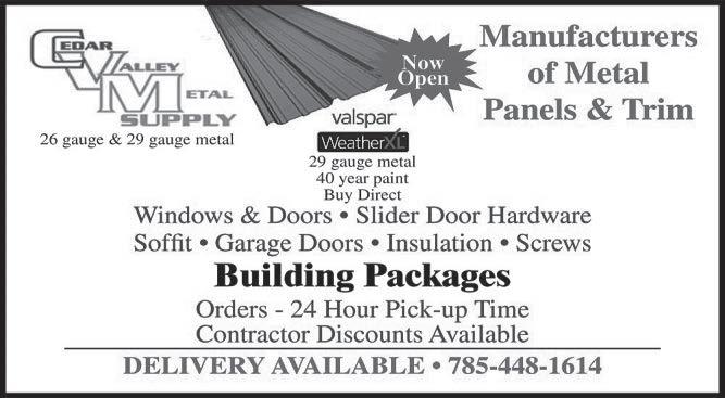 10 THE NEWS/COUNTRYSIDE, WEDNESDAY, APRIL 26, 2023 New Overhead Garage Doors Garage Door Repair Glass Repair Residential & Commercial Gammon Glass 417-667-8176 214 S. Cedar, Nevada, MO 64772 Replacement Windows starting at $270 each installed Moc k Cons truction 417-448-9029 You Buy It, We’ll Ins t all It! 54 VET CLINIC Providing health services for small & large animals. Erik Andersen, DVM 13615 E. Hwy 54 Just West of Nevada on 54 417-667-8381 Veterinary Clinic 54 Find us on Licensed in MO & KS - Digital X-Ray - Ultrasound for Small & Large Animals - Bloodwork - ACL & Knee luxation repair in small animals - Ambulatory Services - Fracture repairs - Small Animal Dentistry - BSE for Bulls Hours: M-F 7:30-5:30, Sat 8-noon 417-667-2633 or hedgesstorage.com for details & availability Mini Storage Units for rent in Nevada, MO 10x10 $50/mo 10x15 $60/mo 10x20 $70/mo 10x30 $100/mo On-site office, convenient location, well-lit at night, video sur veillance, 7ft overhead doors, 24hr access. 8x10 .............. $40/mo 8x10 $400/yr LAMAR 417-682-3301 808 Gulf St. NEVADA 417-667-2560 120 S. Washington STOCKTON 417-276-7070 722 West St. WEBB CITY 417-250-2828 121 W. Broadway www.myvisionsolutions.com • Eye Exams • Glasses • Contacts Comprehensive Medical Eye Care We accept Insurance & Vision Benefits G & L Bookkeeping is taking appointments for the preparation of you tax returns. Reasonable rates and electronic filing. Call Gail at 667-2151 for an appointment. Curb service for the handicapped. ALL SEASON ROOFING & CONSTRUCTION Roofing, Reaper, Remodeling, Construction Power Wash & Gutter Cleaning ABEL MIRANDA 417-321-4031 all.seasonroof@yahoo.com BARTON COUNTY IMPLEMENT SELLING NEW FIRESTONE TIRES Dan Keller 417-321-7722 You MAY want your piano ready for JUNE Tunes For Spring & Summer music that always sounds good call BALK HAY AND STRAW Small Squares, Wire Tied - For Sale Waylon Balk 417-321-2363 Wesley Balk 417-321-7308 8068 S 1900 Rd • Walker, MO Call or Text WILL BE AVAILABLE SOON Top Notch American Construction LLC • ROOFING • SIDING • LAND CLEARING • CONCRETE Paul Guenther 417-321-2711 Ezekiel Yoder 417-684-0564 topnac66gmail.com Paul Guenther 417-321-2711 Licensed & Insured Advertise HERE! 417-667-3344 or 620-223-2110 Honor your Mother in our special Mo er’s Day Section of the May 13th edition of the Nevada Daily Mail/Fort Scott Tibune Submit a photo of your mom and short salute to be featured in this first ever Mothers Day Salute to all of our great mothers! 131 S Cedar • Nevada 417-667-3344 • www.nevadadailymail.com @NevadaDailyMail 6 N. Main • Fort Scott, KS 620-223-2110 • www.fstribune.com @FSTribune