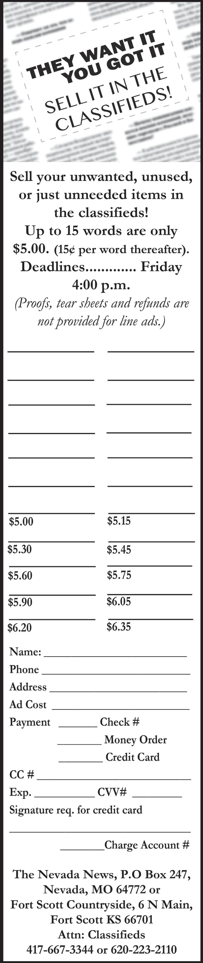 Contact your consultant today to place your ad! 417-667-3344 620-223-2110