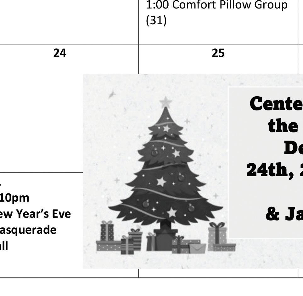 The Center will be Closed 12/24, 12/25, 12/26, 12/31 & 1/1.