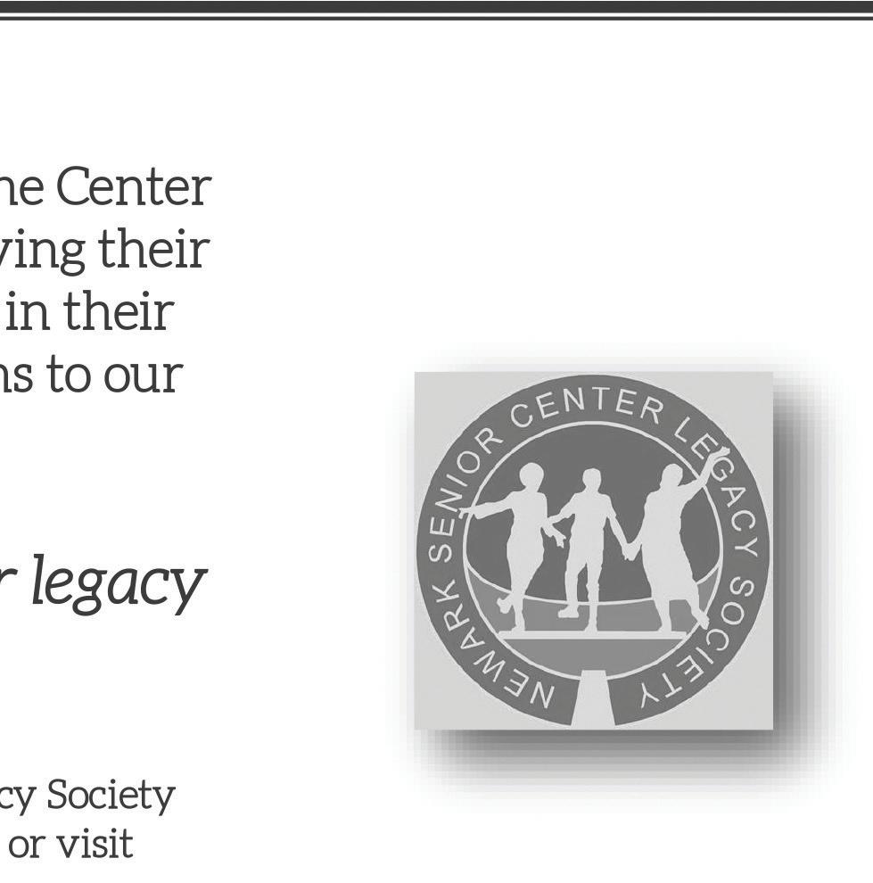 Throughout the year, we host di erent receptions to speci cally thank our donors and volunteers for their support of the Center, but I would like to take this opportunity to thank all our members for the part they play in making the Newark Senior Center more than just a facility. There are so many little acts of kindness in the Center every day. Whether you are helping someone with their lunch tray, pointing someone toward the computer lab or showing someone how to nd their exercise class on the monitors, you are a part of making the Center a community where people feel safe and valued. Thank you.