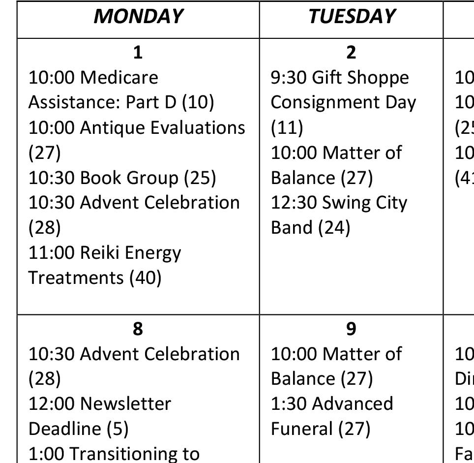 All December Newsletter submissions must be received by: December 8th at 12noon You can leave submissions with Margaret Fraser, Secretary, or email them to hmitchell@newarkseniorcenter.com