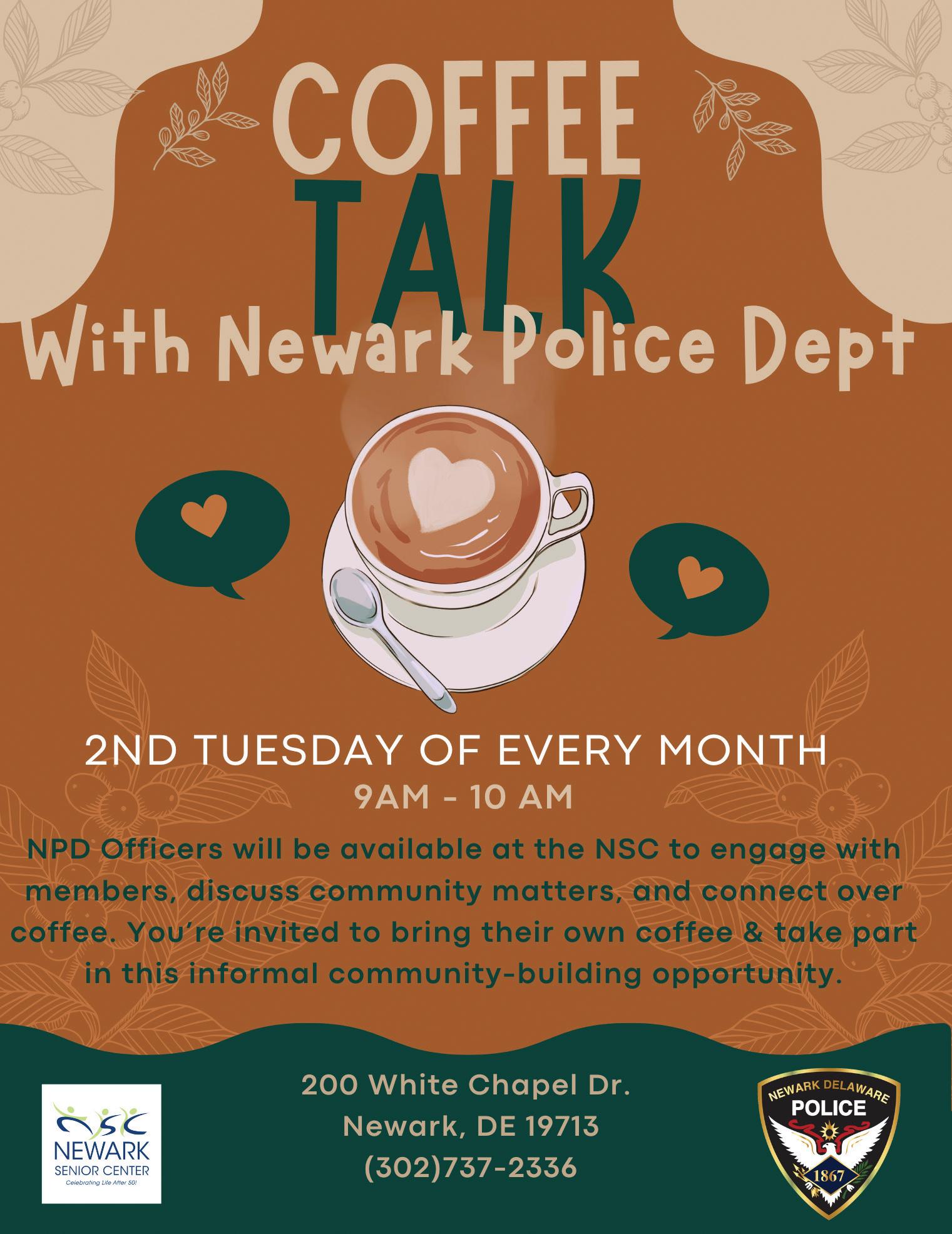 Officers from the Newark Police Department will be available at the NSC to engage with members, discuss community matters, and connect over coffee. Attendees are invited to bring their own coffee & take part in this informal community-building opportunity.