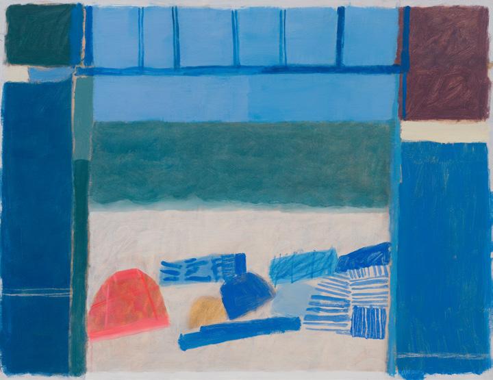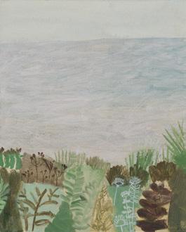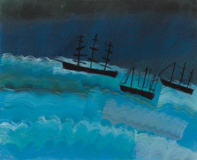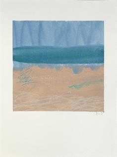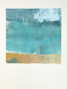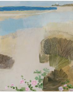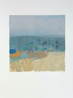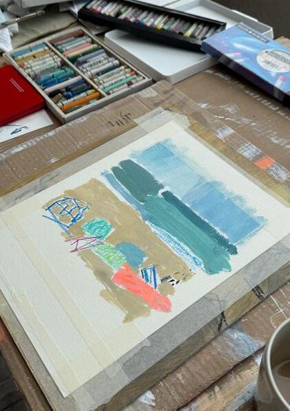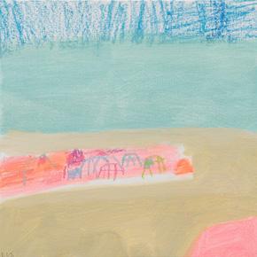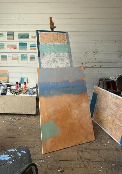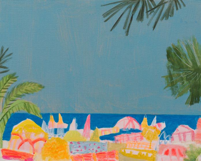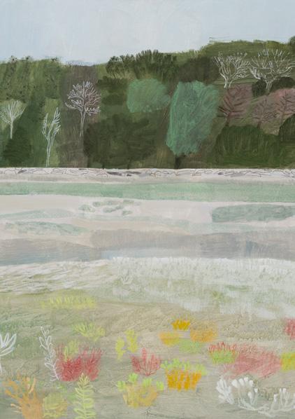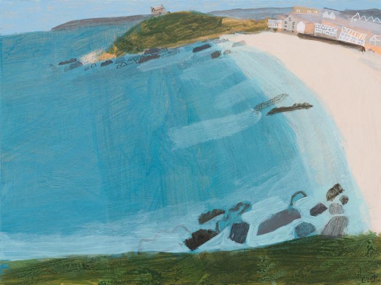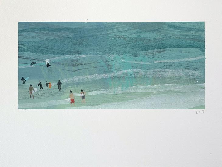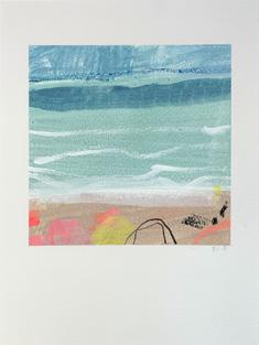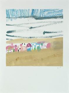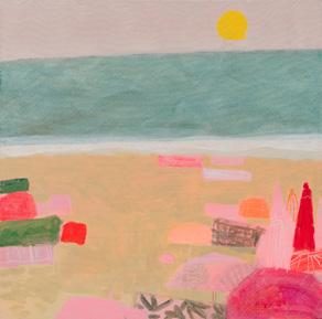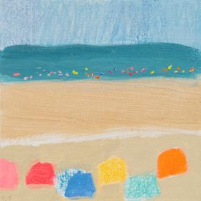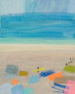 that overlooks the beach, I became mesmerised by the constant activity of beachgoers and the continual change of tide and weather. I was inspired to capture it all quickly on paper, with simple fluid marks, as little sketches in paint. It was enormously freeing. A couple of paintings in this collection are based on those sketches and no doubt more will come.