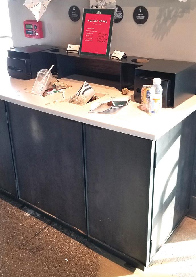 After reporting that Starbucks was forcing workers to pressure the public into tipping them—when paying by credit card—we were throttled to see trash piled up and a puddle of what looked like spilled coffee over the floor, creating a hazard, at their Tilton, New Hampshire location.