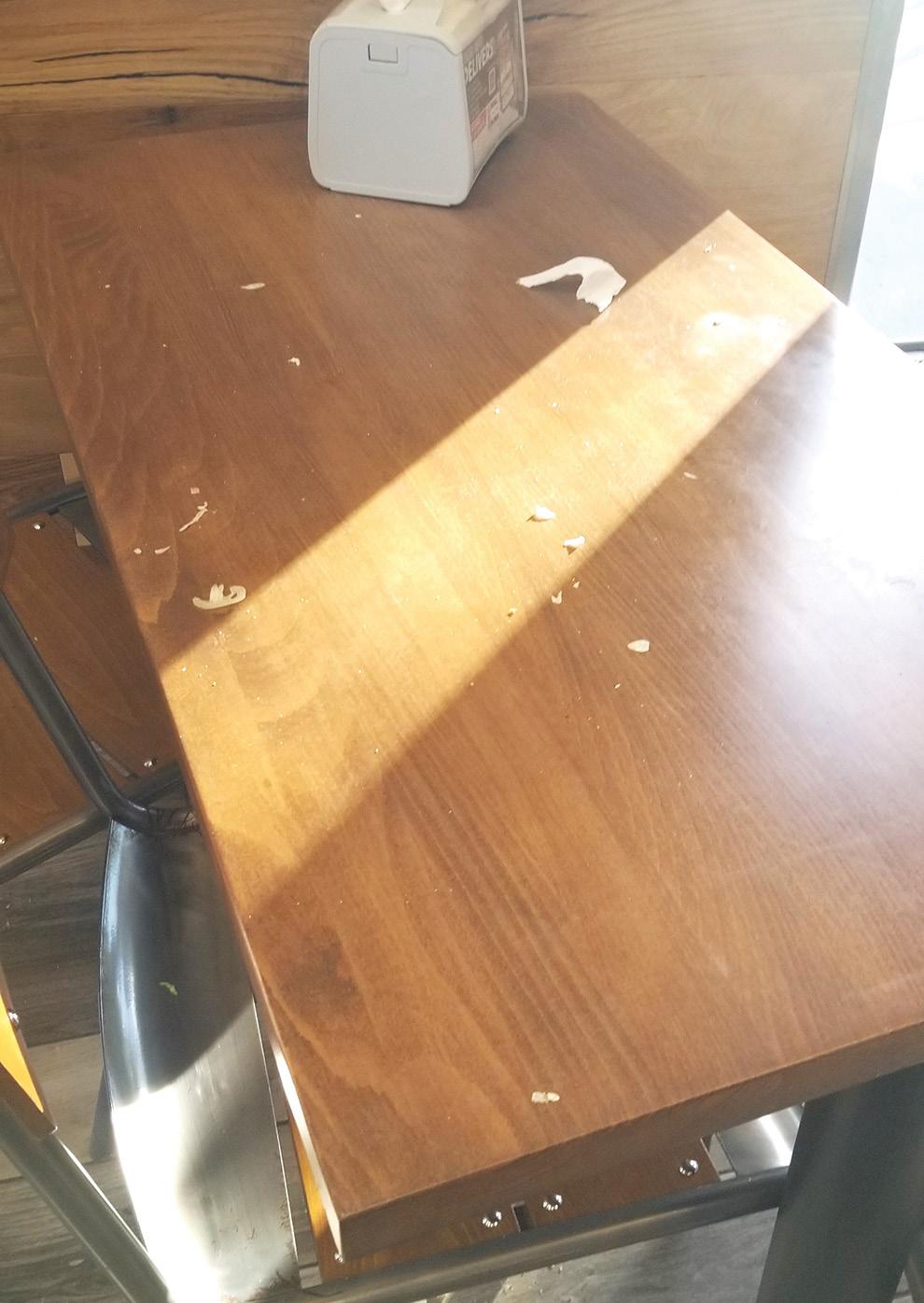 Over at Jersey Mikes, in Wareham, Massachusetts, not far from the tip-cup, was a table that sat untouched during our visit. Opting for take-out, we lingered to see if an employee ever tried to clean the table. Sadly, while there were very few customers, leaving plenty of time to clean up, the staff enjoyed discussing their social life.