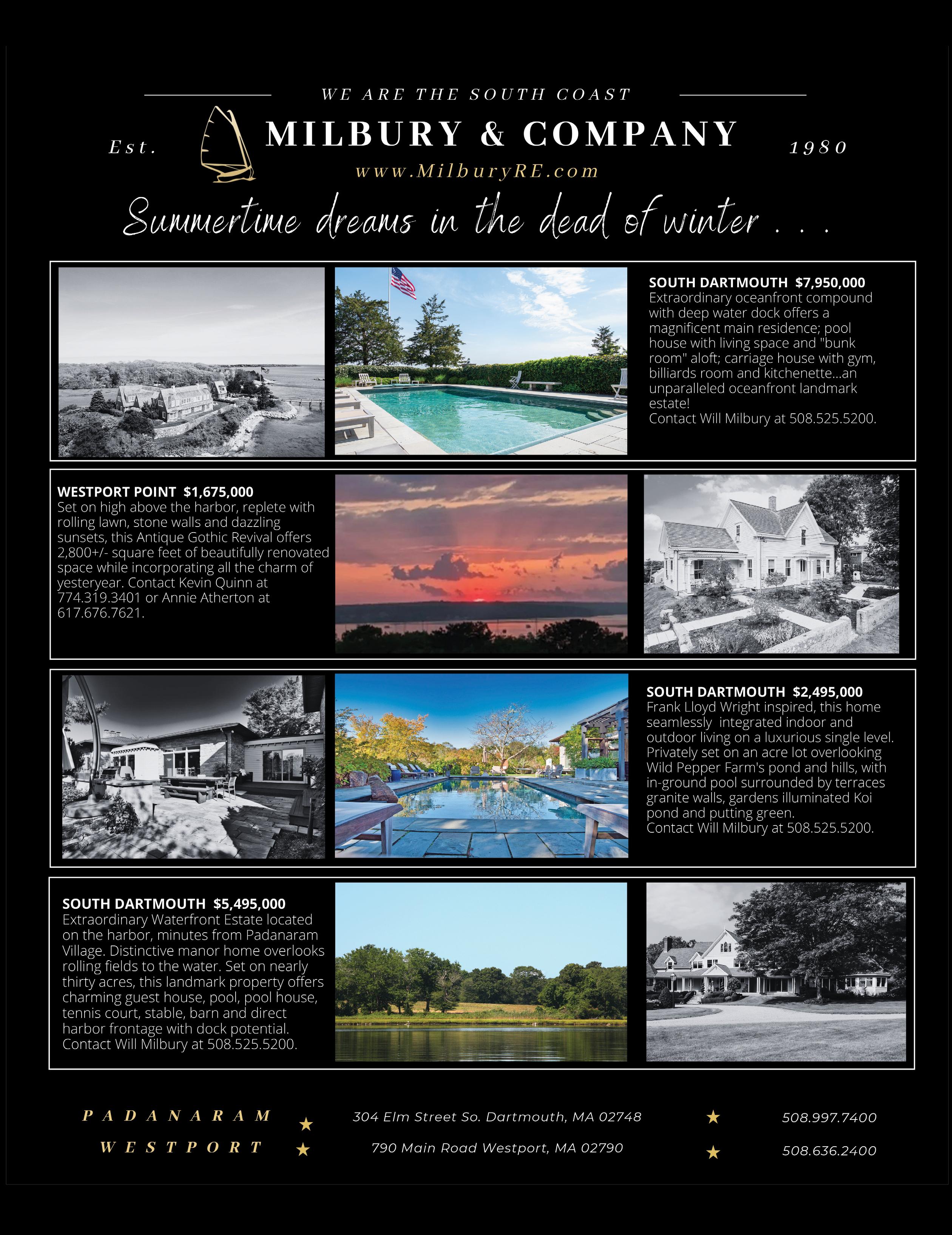 W E A R E T H E S O U T H C O A S T 7 9 0 M a i n R o a d W e s t p o r t , M A 0 2 7 9 0 W E S T P O R T 3 0 4 E l m S t r e e t S o D a r t m o u t h , M A 0 2 7 4 8 M I L B U R Y & C O M P A N Y w w w . M i l b u r y R E . c o m E s t 1 9 8 0 P A D A N A R A M 5 0 8 9 9 7 7 4 0 0 5 0 8 6 3 6 2 4 0 0