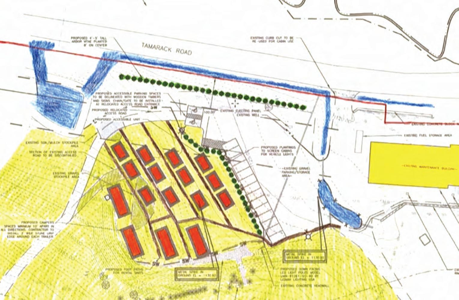 The board approved the plan with several conditions, including that all site improvements be completed before any cabins are installed and that all lighting remain downcast and shielded from neighboring properties.