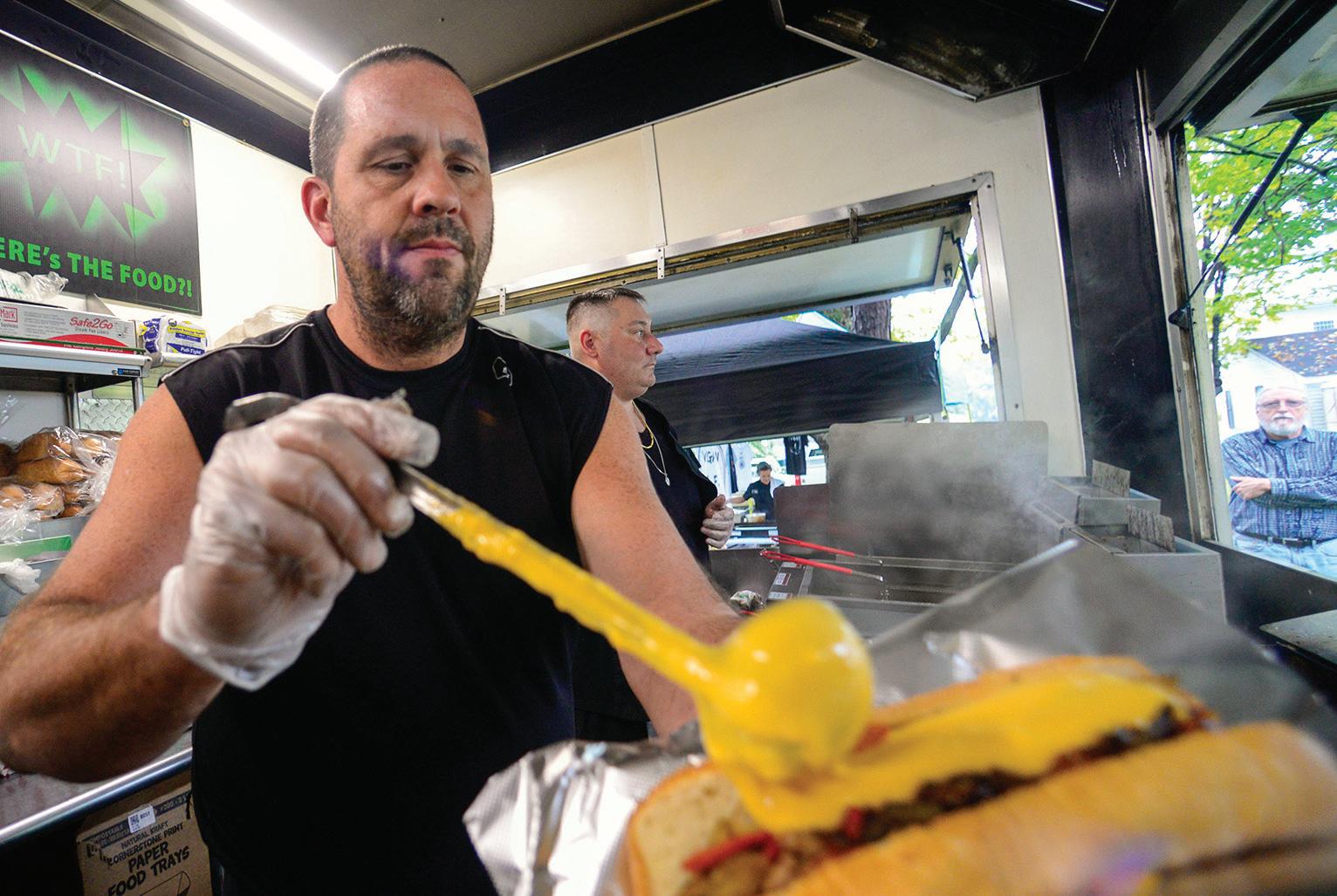 Ryan Kinney puts cheese whiz onto a cheesesteak during the Brattleboro Reformer’s New England Street Food Festival on Saturday, Sept. 30, 2023.