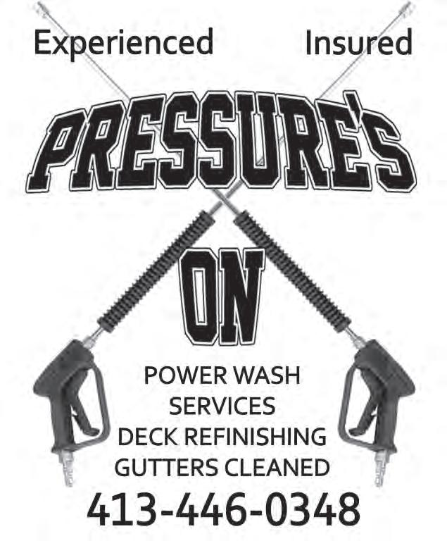 CUSTOMDESIGN BLOCK-BRICK-STONE-CONCRETE-STUCCO SPECIALIZINGIN:Steps-Sidewalks-PatiosGranite-Slate-Fireplaces-BlueStone-Cement StampColoredConcrete-CustomPoolDeckDesign Flagstone-RetainingStoneWalls-Driveways-StoneWork “CompleteMasonryWorkforOver37Years” THEBESTPRICESAROUND-FREEESTIMATES-FULLYINSURED SERVINGNY/CT/MA CALLALBERT:CELL203-509-4935 CUSTOMFURNITURE Design&Build CabinetryMetalWork MillWorkCarpentry ADAMZAMBERLETTI 413-429-1599 azcustom413@outlook.com ResidentialDesign Kitchen/BathDesign DESIGNANDPLANNINGChristopherBlair ConstructionManagement ProjectRepresentation 413.528.4960623MainStreet,GreatBarrington,MA01230 n Residential andCommercial SiteWork n SepticSystems n Driveways n LandClearing n Trucking GRAVEL n FILL STONE n TOPSOIL ILLIAMS W W.STOCKBRIDGE,MA (O) 413-232-7966 ( F ) 413-232-7933 (C ) 650-703-7350 ( E ) cwe2007@outlook.com QualityPainting Exterior&Interior Stain Decks&Houses HomeImprovement GutterCleaning FloorRefinishing Drywall&Plaster MannySaavedra rrliberty613@gmail.com (518) 325-1423 FREEESTIMATES  INSURED M ANNY ' S C LEAR V IEW P ROFESSIONAL W I NDOW CL E A N ING LLC. WINDOW CLEANING GINOFURIO GENERAL CONTRACTOR Design,Build,Remodel GINOFURIOLLC 413-854-1940 ginofurio98@gmail.com HIC203681/Insured/CS116721 SEPTICTANKPUMPING Residential•Commercial DrainLinesCleaned•TankLocating SewerPumpRepair&Replacement PortableToiletRentals PortableWashStationRentals SPECIALIZINGIN InstallationofResidential&Commercial Sewage&SepticSystems MT.EVERETTSANITATION RonLeonard•GreatBarrington FREEESTIMATES •RadioDispatched •FreeComputerReminderService •FullyInsured •AskaboutourFullWarranty 413/528-3364