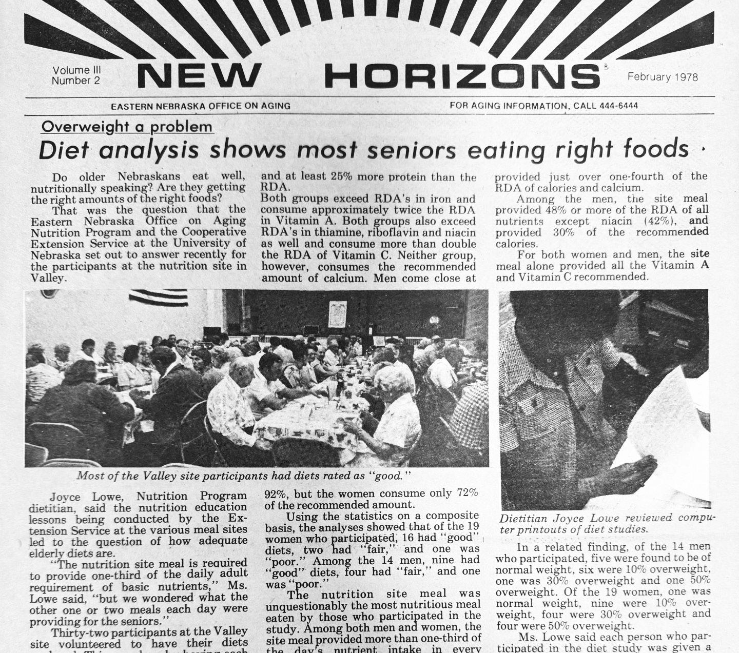 Advertisements appearing in New Horizons do not imply endorsement of the advertiser by the Eastern Nebraska Office on Aging. However, complaints about advertisers will be reviewed and, if warranted, their advertising discontinued. Display and insert advertising rates available on request. Open rates are commissionable, with discounts for extended runs. Circulation is 9,000 through direct mail .