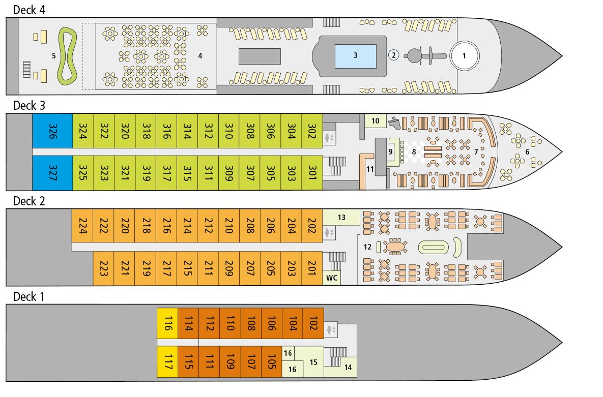 Everything else is taken care of, meaning you can just relax and enjoy your cruise to the fullest. For a small supplement, enjoy selected extra treats such as ice cream on the sun deck, freshly squeezed fruit juices, wine tasting and speciality cheeses.