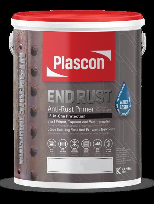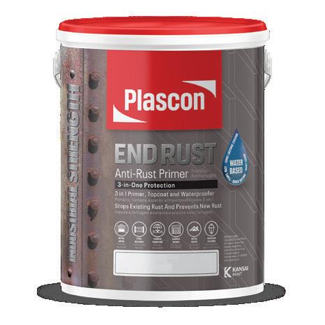 Plascon End Rust Primer combines a primer, topcoat, and waterproofer in one easy-to-use, water-based formula. It stops existing rust and prevents new corrosion while providing a durable, weatherproof finish. Ideal for gates, roofs, garden furniture, and outdoor metalwork, it’s quick-drying, low-odour, and eco-friendly. Available in Red Oxide, Grey, Black, and White, in 500ml, 1L, and 5L packs.