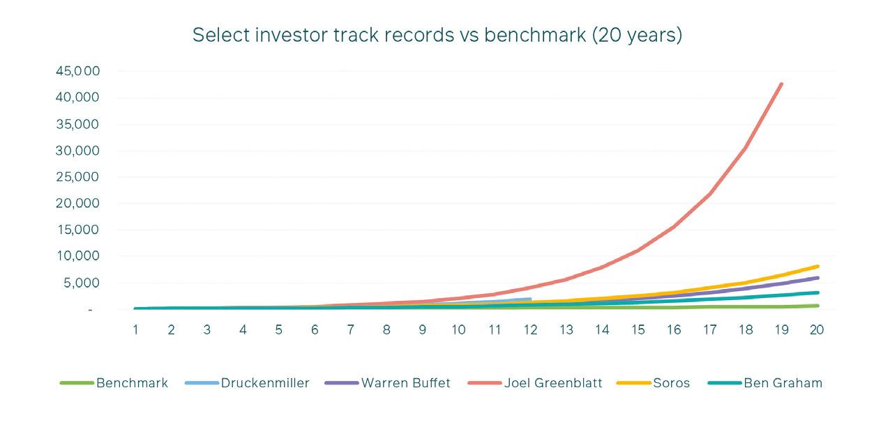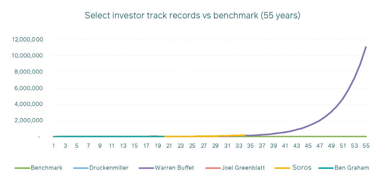 The figure above, sourced from ‘Excess Returns’ by Frederik Vanhaverbeke, offers a valuable comparison of the excess returns achieved by several rockstar investors (relative to the S&P 500) and the length of time over which those excess returns were sustained.