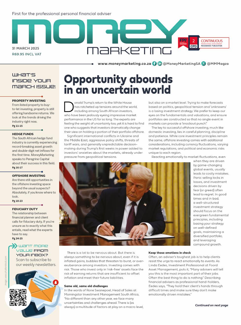 Donald Trump’s return to the White House has ratcheted up tensions around the world, including among South African investors, who have been jealously eyeing impressive market performance in the US for so long. The experts are feeling the weight of uncertainty too, yet it is hard to find one who suggests that investors dramatically change their view on holding a portion of their portfolio offshore. Significant international conflicts in Ukraine and the Middle East, aggressive policy shifts, threats of tariff wars, and generally unpredictable decisionmaking during Trump’s first weeks in power added to investors’ anxieties about the markets, already under pressure from geopolitical tensions.