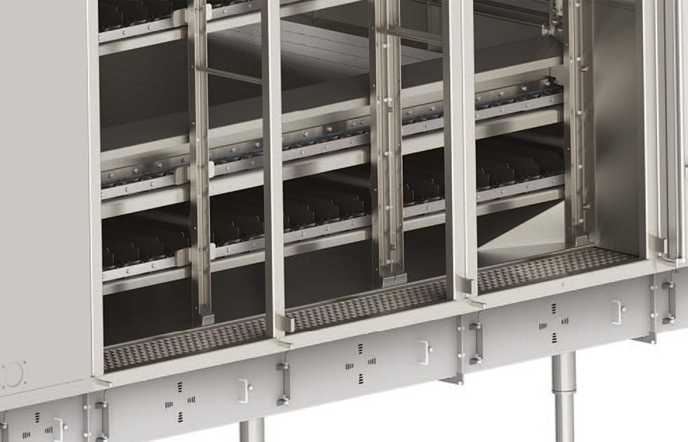 Increased access for maintenance: Downtime for cleaning can eat into valuable production time. The Solis has been designed to shorten the cleaning cycle as much as possible while still providing a food-safe drying process. The innovations in this area include an increase in the distance between the lower conveyor and the dryer floor, which provides greater access; large inner and outer doors that make for quick, easy, and effective cleaning; and a unique support structure that puts fewer feet to the factory floor, making cleaning beneath the dryer much easier.