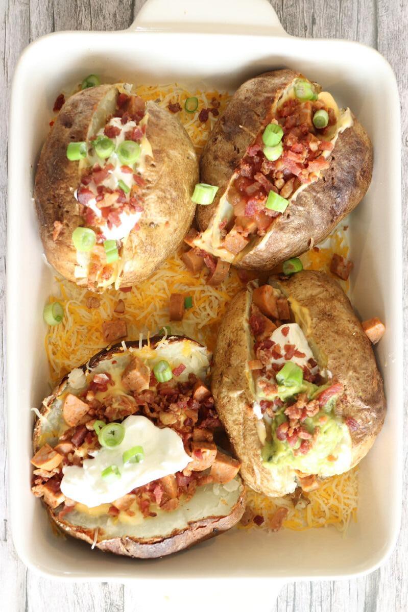 3. Slice open each potato, fluff the insides, and serve with desired toppings.