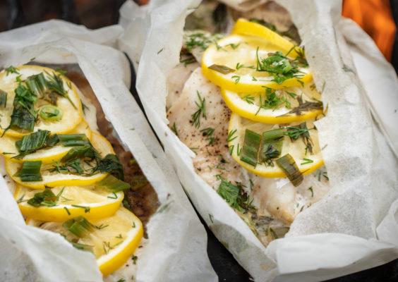 3. Curve up the edges of parchment a little so the liquid doesn’t run off, then sprinkle oil and wine over top. Top with lemon slices.