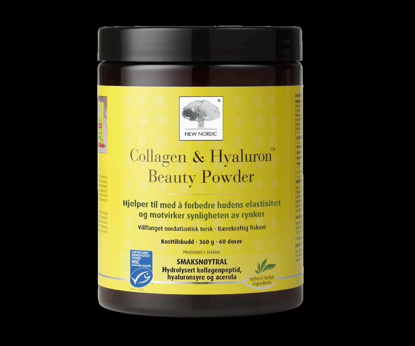 Den PRISVINNENDE Collagen & Hyaluron™ Beauty Powder er et unikt hudpleiekosttilskudd, som tilfører næringsstoffer til huden innenfra. Kollagen hjelper til med å forbedre hudens elastisitet og motvirker synligheten av rynker samt bidrar til følelsen av god fuktighet i huden. Collagen & Hyaluron™ Beauty Powder kombinerer hydrolysert maritimt kollagenpeptidpulver (type 1) og hyaluronsyre med vitamin C. Vitamin C bidrar til normal kollagendannelse, som har betydning for normalt fungerende hud. Kollagen er en viktig strukturell komponent i flere vev i huden, bl.a. bindevev inkludert elastin, som har betydning for hudens fasthet. Vitamin C beskytter også kroppens celler, deriblant hudcellene, mot oksidativt stress forårsaket av frie radikaler.