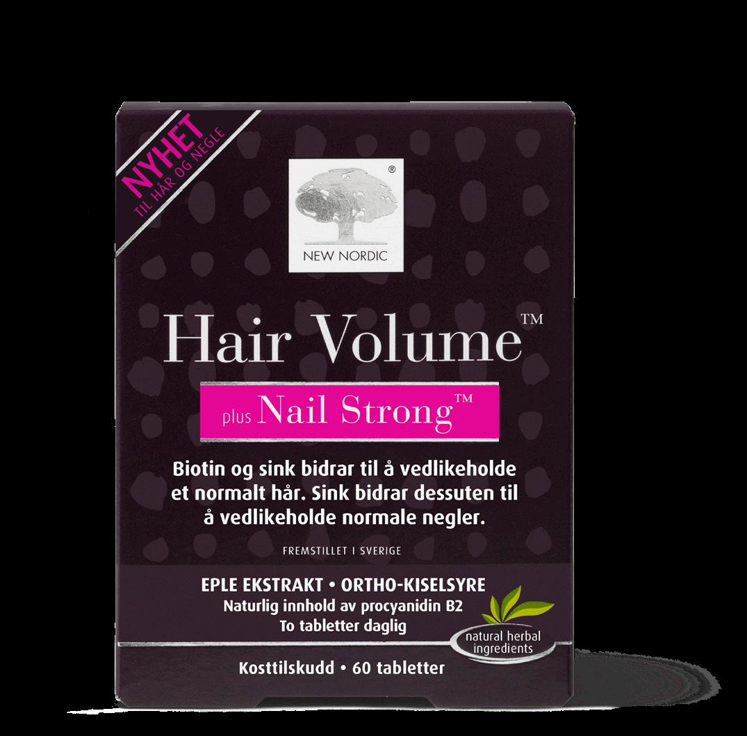 Hair Volume™ plus Nail Strong™ er en tablett av epleekstrakt med et naturlig innhold av procyanidin B2 pluss kolin-stabilisert ortho-kiselsyre, som er en biotilgjengelig form av silisium. Tabletten inneholder også hirse, kjerringrokk, biotin, sink og kobber. Tabletten tilfører næringsstoffer til hodebunnen og hårsekken (hårstråets ”rot”), hvor håret dannes samt til neglenes cellematrix. Innholdet av biotin og sink hjelper med å vedlikeholde et normalt hår. Sink bidrar dessuten til å vedlikeholde normale negler. Kobber bidrar til en normal pigmentering av håret.