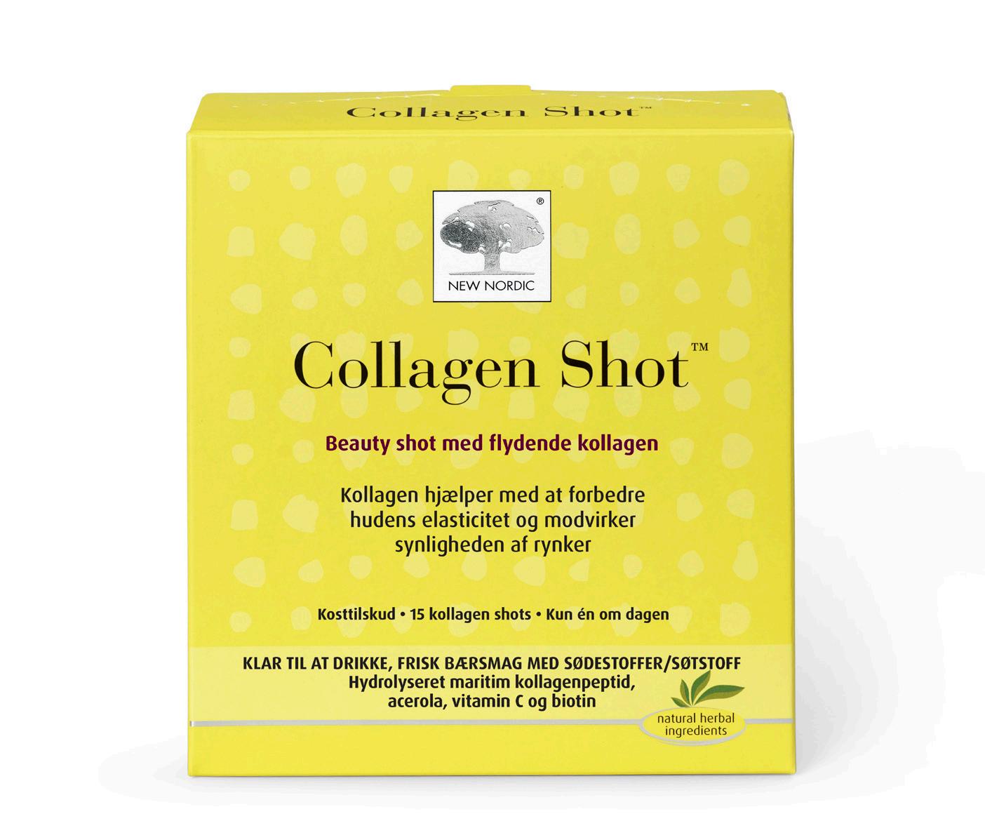 Collagen Shot™ inneholder førsteklasses hydrolysert maritimt kollagen kombinert med acerola, vitamin C og biotin. Kollagen kan bidra til å bedre hudens elastisitet og redusere forekomsten av rynker. Vitamin C kan bidra til en normal dannelse av kollagen, slik at huden fungerer normalt.