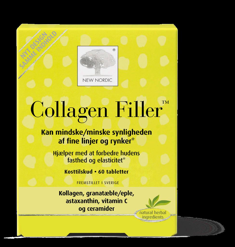 Collagen Filler™ er basert på marint kollagen samt ekstrakt av blant annet granateple og tomat. Tabletten inneholder også vitamin C, som ikke bare kan bidra til normal dannelse av kollagen, men som også kan bidra til å beskytte cellene mot oksidativt stress. Nedbrytning av celler er medvirkende til synlig aldring forårsaket av solens skadelige UV-stråler og forurensning. Denne hudpleietabletten kan bidra til å redusere synligheten av fine linjer og rynker ved å tilføre næringsstoffer innenfra. Tabletten kan også hjelpe til med å forbedre hudens fasthet og elastisitet for en strålende og fin hud.