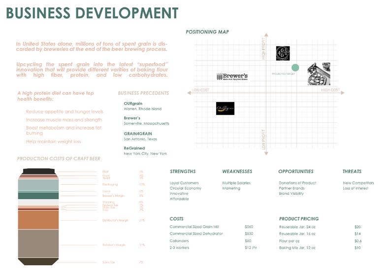 Using the by-products of brewing and food processing, students develop 1) a business proposal and 2) a space for their business. Using Spent Grains, three teams developed dishware products, flour, and bread