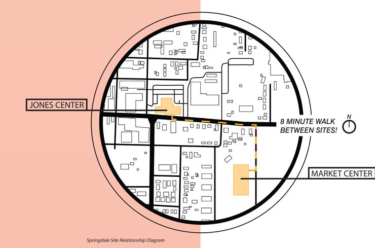 The Jones Center is a recreation, education, and event center for families located in downtown Springdale, Arkansas. Jones Center announced the “Jones Campus Vision” in 2021 and aimed to become more integrated into the community. Moving forward, the Jones Center is looking for other options for utilizing a part of “Harvey Jones Education Building.” Market Center of the Ozarks and Harvey Jones Education Building can be found 0.2 miles apart across East Emma Avenue.