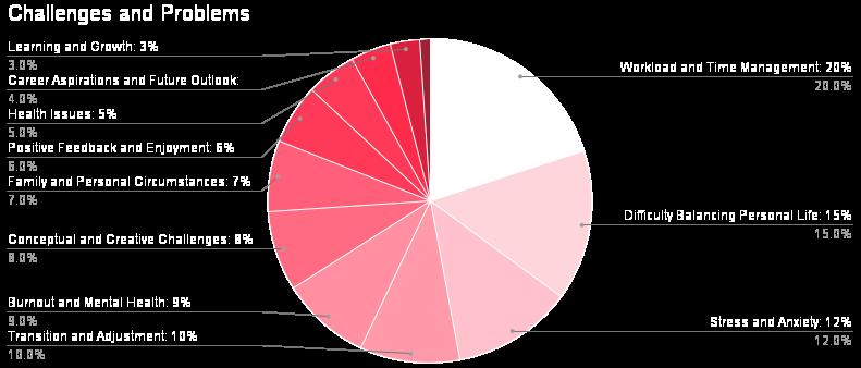 The overarching theme is a balance between hard work, dedication, and time management, while also prioritizing well-being, individual creativity, and a positive mindset. Collaboration, seeking help, and learning from challenges are emphasized throughout the responses. The journey is recognized as challenging but rewarding, with a focus on personal and professional growth.
