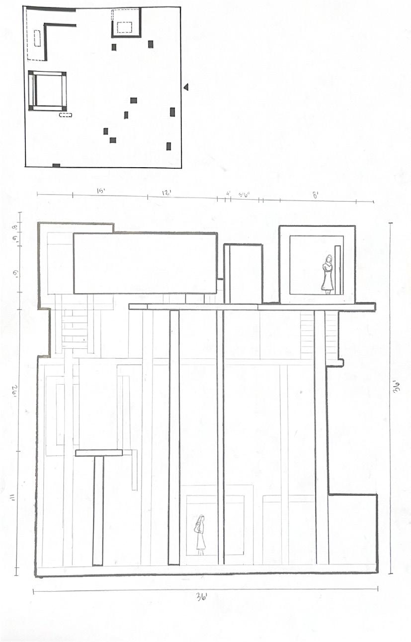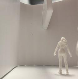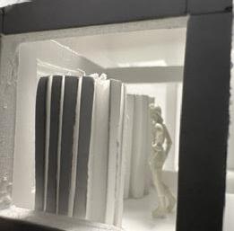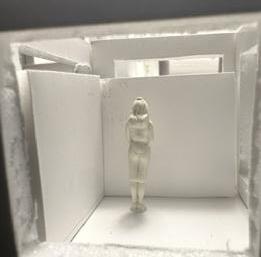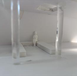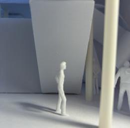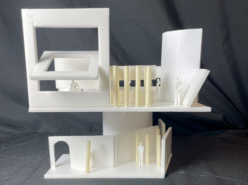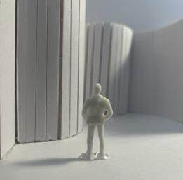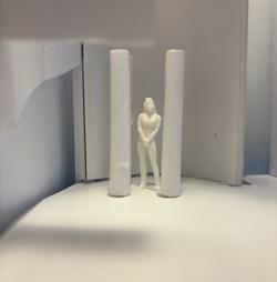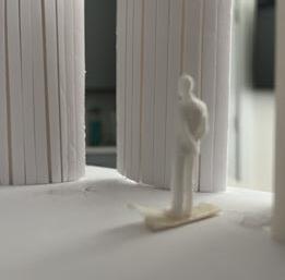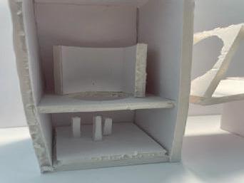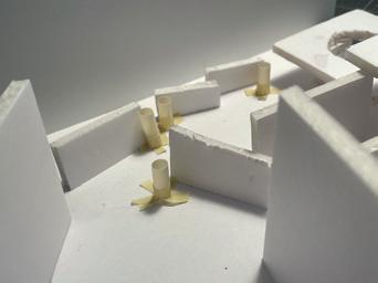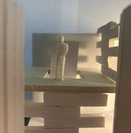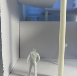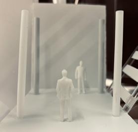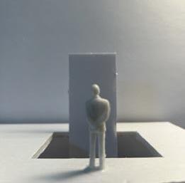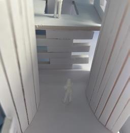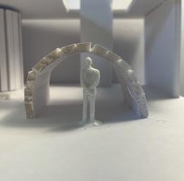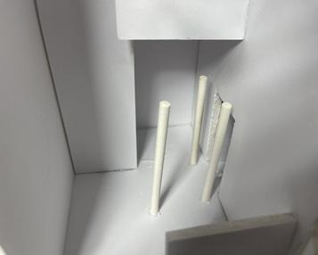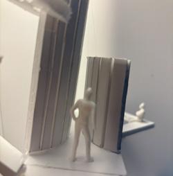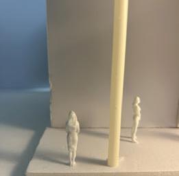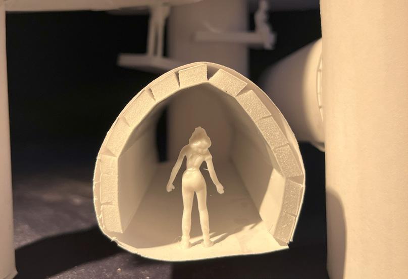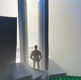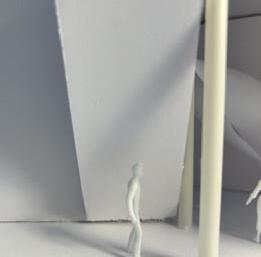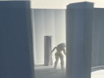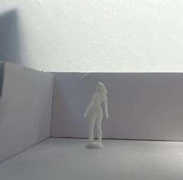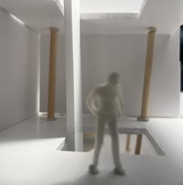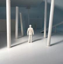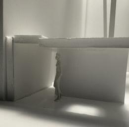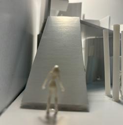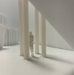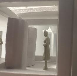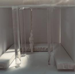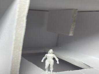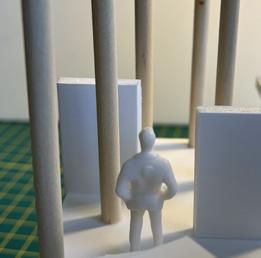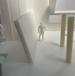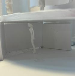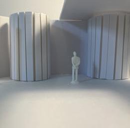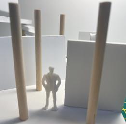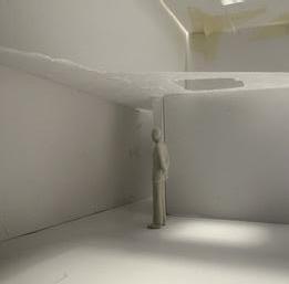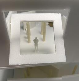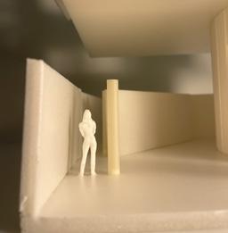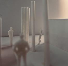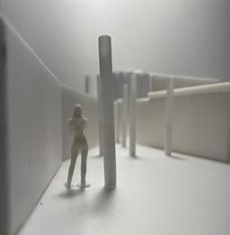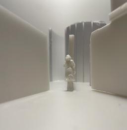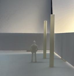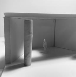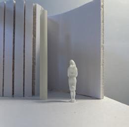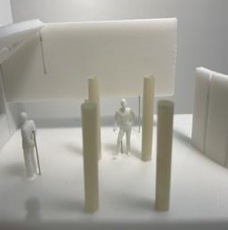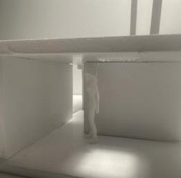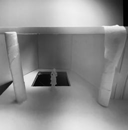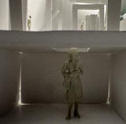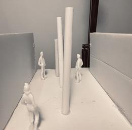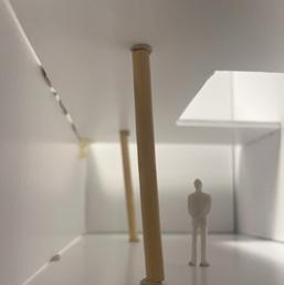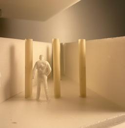 Next is category 21. Although I altered the shape and number of columns to best t the space, it s�ll has the same effect. I decided to make this scene more open by li�ing the ceiling above it. I did this in order to allow viewers to see this part of the display be�er. The image I chose shows four columns widely set. A human gure stands in the middle of the four columns. The image makes me feel scared and claustrophobic due to the columns being placed close together.