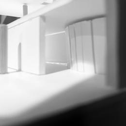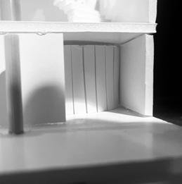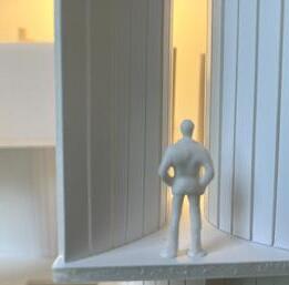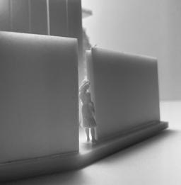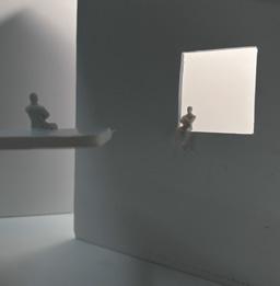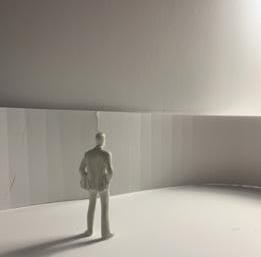 In the ninth photo, the wall faces the figure, and a square void shines light through. As I look at the walls and voids, I see the differences in the light. As it changes, the room gets lighter or darker. This leads to different emotions as the light changes. I feel sad being in the darkness. I want to be in the light again.