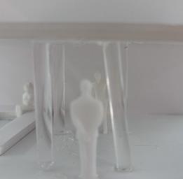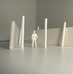 In the fourth photo, the columns are parallel. The figure is standing, looking through the columns. I looked through them and saw more obstacles on the other side of the columns. The walls then became narrower, getting closer to me. I started to feel more claustrophobic and wanted someone there with me, but no one was there.